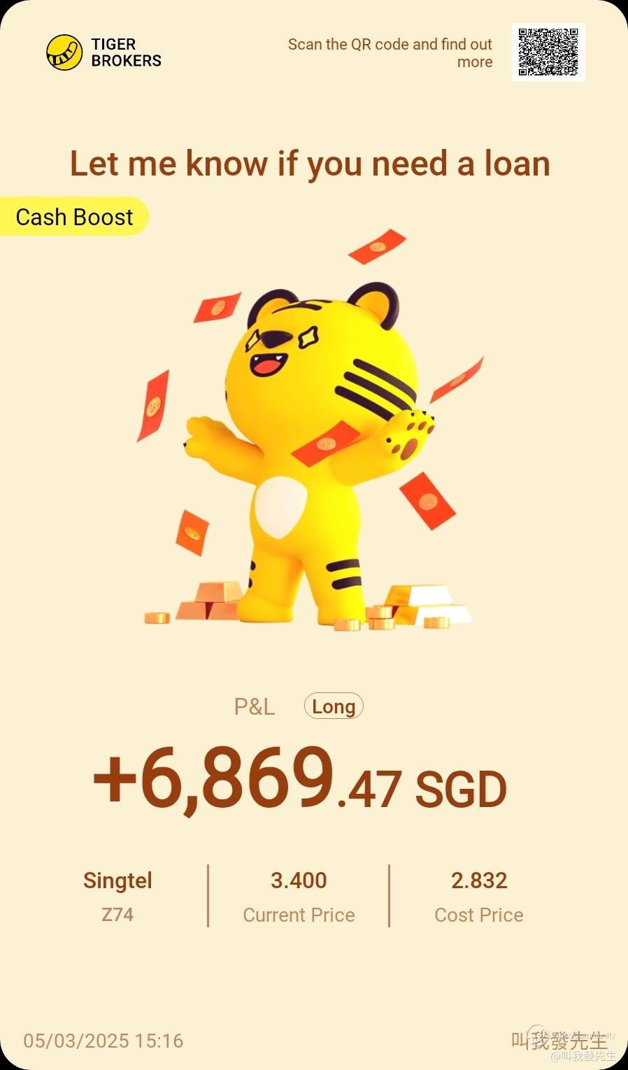 On March 5, we're happy to see @叫我發先生 share his earning by investing with CBA again. Congrats to @叫我發先生 make SGD 6869 in one day by investing in $Singtel(Z74.SI)$ with a CBA.