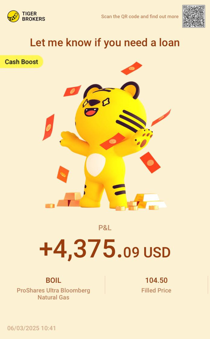 On March 6, congrats to @BelindaHaywood for making $4375 per day by investing in $ProShares Ultra Bloomberg Natural Gas(BOIL)$ with a Cash Boost Account. Although the US market is consolidating recently, BelindaHaywood still chose to go long all in on BOIL. We are happy to know BelindaHaywood's appreciation of Tiger Brokers and the full CBA quota.