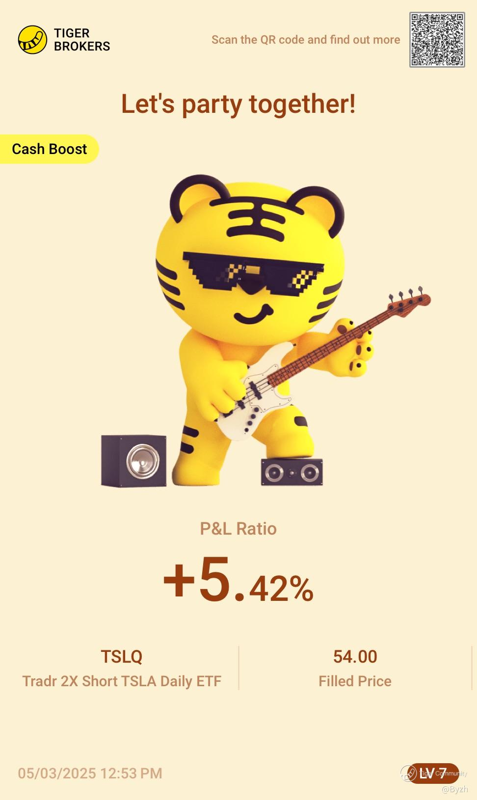 On March 5, we're excited to see @Byzh made a profit of 5.42% by investing in $Tradr 2X Short TSLA Daily ETF(TSLQ)$ with a CBA. Byzh Perfect exited at the highest point intraday. And Byzh believed fundamentals were still weak, bearing until 250.