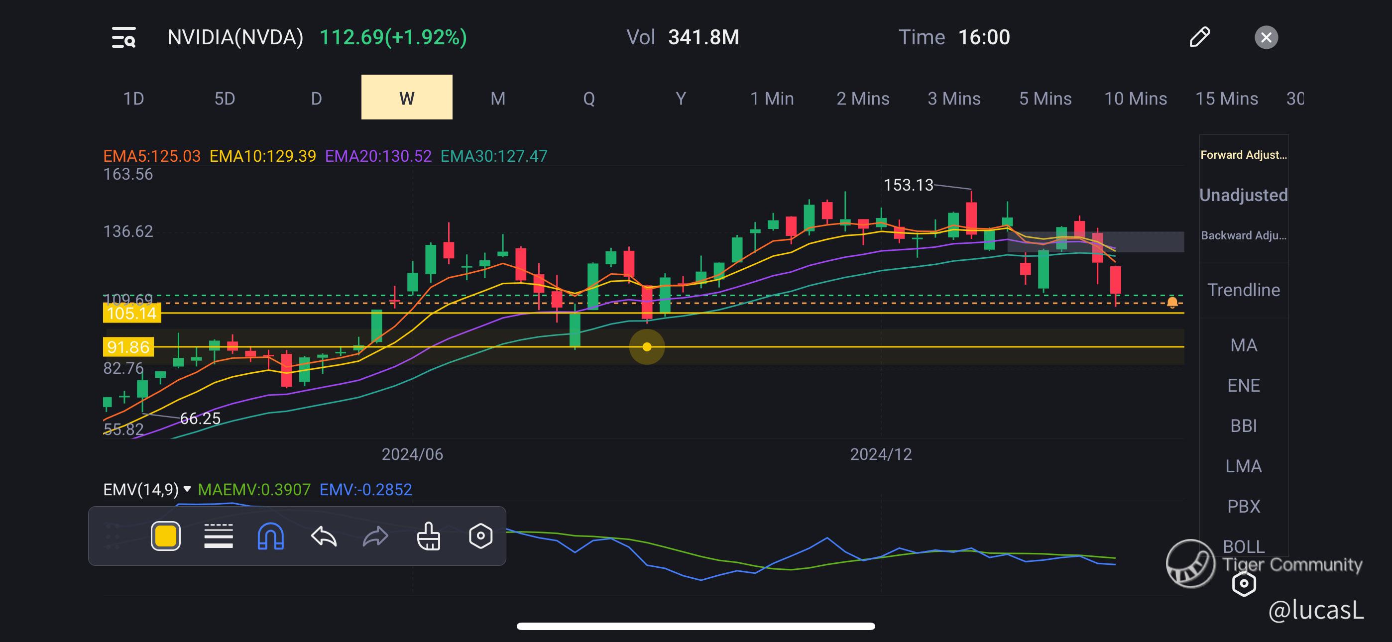 This week, we’re keeping a close eye on NVIDIA’s price action. The chart highlights two key support levels: **105** and **92**. While the trend remains intact, the current price level is still relatively high, indicating potential risks. Stay cautious and monitor these levels closely for any signs of a breakout or reversal.