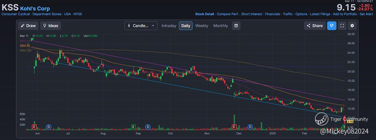 KSS are tumbling on Tuesday, with the stock down 25.1%, after dropping as much as 27.4% earlier in the day. The sharp decline follows a broader market downturn, as the S&P 500 slips 0.4% and the Nasdaq Composite dips 0.2%.