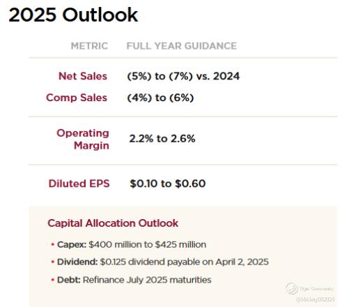 The department store chain posted lackluster fourth-quarter results, reporting a 9.4% decline in revenue and a 6.7% drop in same-store sales year over year (YOY). Earnings per share (EPS) came in at $0.95—down significantly from $1.67 in the prior-year period—though it still surpassed Wall Street's estimate of $0.75. For the full year 2025, the company forecasts net sales will decline by 5% to 7%, with diluted earnings per share expected to range from 10 cents to 60 cents. Analysts had projected a slight sales increase of 0.2% year-over-year, with earnings expected to be around $1.22 per share.
