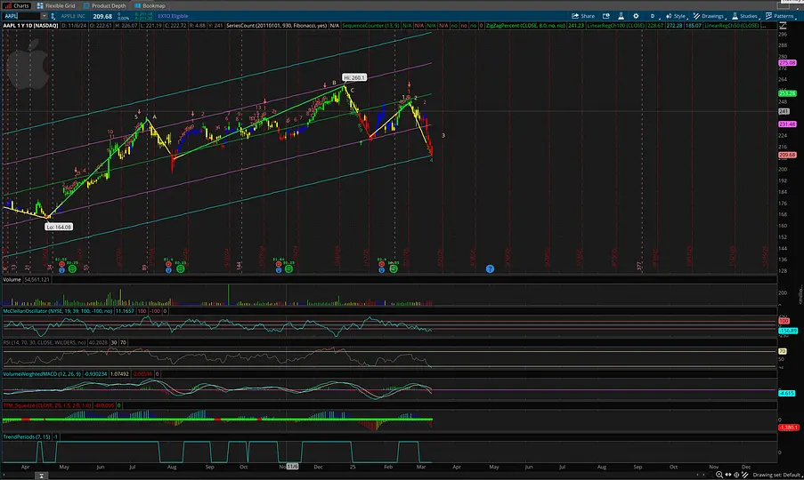 $Apple(AAPL)$ Well, we are getting there. This is at the end of a brutal corrective Elliott wave 2 & about to begin a very rare pattern when the next wave 3 begins, for it will emanate from the bottom of the LRC in the longest strongest Elliott wave, that now has a probability to go parabolic. However, the TDSequential Demark is only on a bearish 4 count & we need a 9 for launch, so next week. It is way oversold but not extreme yet & the indicators are still bottoming. It will hard rally next week on the TDSD 9 count, which could be more of a lateral move so you can add anytime. Watch that McClellan, wht the begins to rise, Buy! Beautiful Bullish chart.
