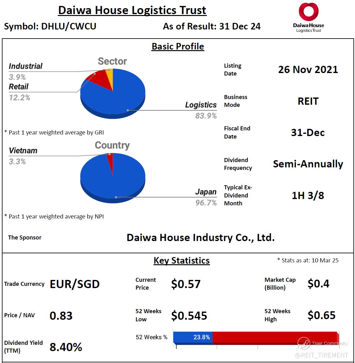 Gross revenue and NPI improved YoY, primarily driven by contributions from DPL Ibaraki Yuki and D Project Tan Duc 2, acquired in 2024. However, the weakening JPY against SGD partially offset these gains. Meanwhile, distributable income and DPU declined YoY due to lower realized foreign exchange gains and higher finance expenses.