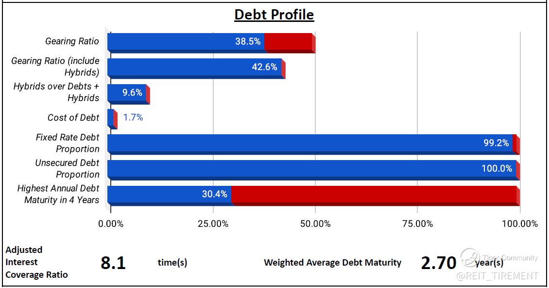 Compared to the previous quarter, gross revenue and NPI improved due to contributions from D Project Tan Duc 2. However, distributable income and DPU declined due to lower realized exchange gains and higher finance expenses. In terms of debt, 25% will mature in 2025, requiring refinancing.