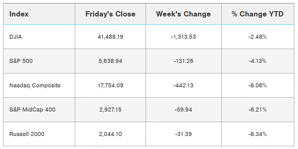 U.S. stocks posted losses for the week, with the S&P 500 Index, Nasdaq Composite, and Russell 2000 Index all notching a fourth consecutive week of negative returns and the S&P MidCap 400 Index falling for the seventh week in a row, while the Dow Jones Industrial Average slid 3.07%, putting all five indexes into negative territory for the year. Ongoing uncertainty surrounding trade policy seemed to drive much of the negative sentiment as new tariff announcements from the Trump administration continued throughout the week. Growth concerns and increasing recession fearsβwhich were amplified by comments from President Donald Trump regarding a βperiod of transitionβ for the U.S. economyβalso weighed on sentiment during the week.