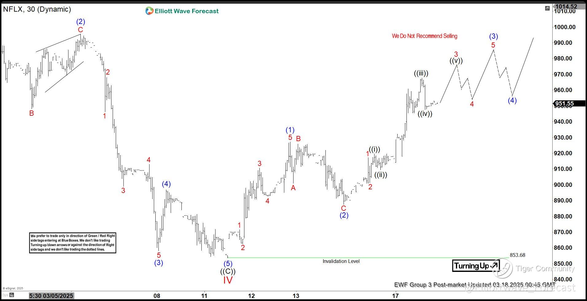 Short term outlook in Netflix (NFLX) suggests that the ETF has ended wave IV at 853.68. Decline from 2.18.2025 high is in progress as a zigzag Elliott Wave structure. Down from 2.18.2025 high, wave ((A)) ended at 955 and wave ((B)) ended at 1000.89. Wave ((C)) lower unfolded in 5 waves impulse structure. Down from wave ((B)), wave (1) ended at 958.17 and wave (2) ended at 995.6. Wave (3) lower ended at 858.11 and wave (4) rally ended at 896.9. Final leg wave (5) ended at 853.6 which completed wave ((C)) of IV.