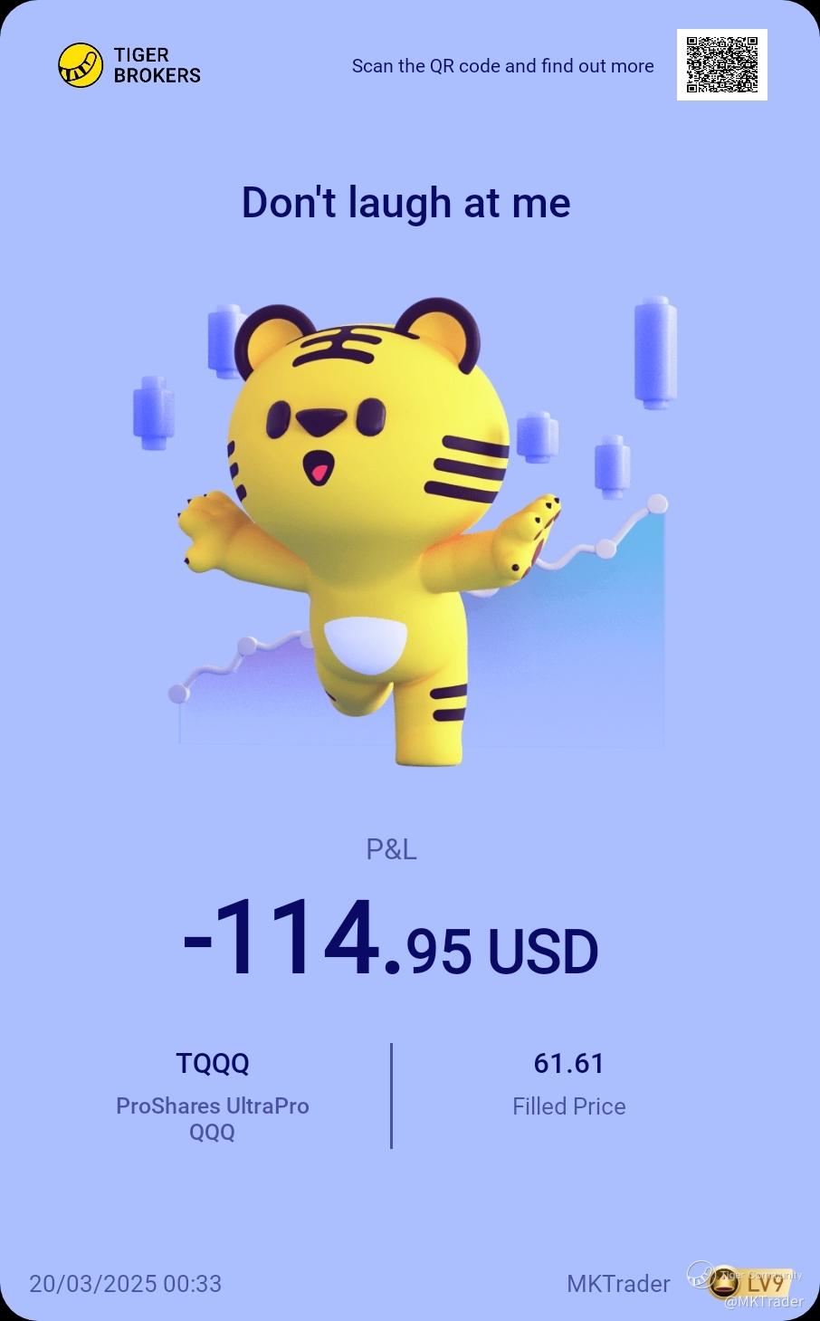$ProShares UltraPro QQQ(TQQQ)$ Scalping training, 8. Burned myself again due to greed. Lol. Sizing is so important. Due to over sized position, I couldn't hold it for too long. If I held it for another 2 minutes it would have been positive usd200. Lesson learned is sizing properly.