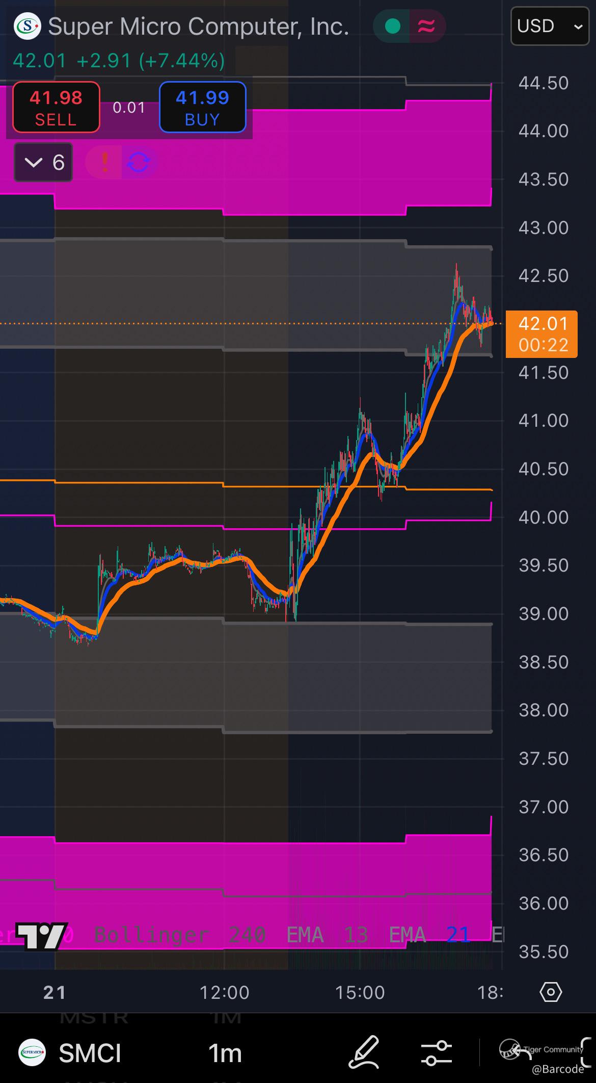 • Moving Average Alignment: SMCI trades above its volume-weighted moving averages: VMA1 (42.40), VMA2 (42.28), VMA3 (41.97), VMA4 (41.53), and VMA5 (41.08). This bullish stack suggests a potential trend continuation, with the shorter-term VMAs acting as dynamic support.