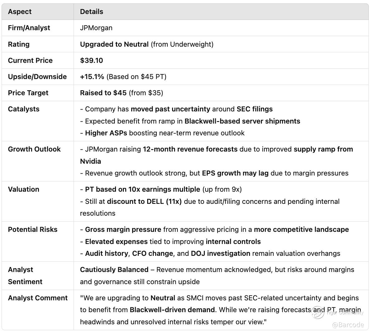 JPMorgan’s upgrade on SMCI is a turning point. The firm raised its rating from Underweight to Neutral, lifting its price target to $45.00. This upgrade reflects SMCI’s progress in overcoming operational challenges, including SEC filing delays, and its readiness to capitalise on the AI infrastructure boom.