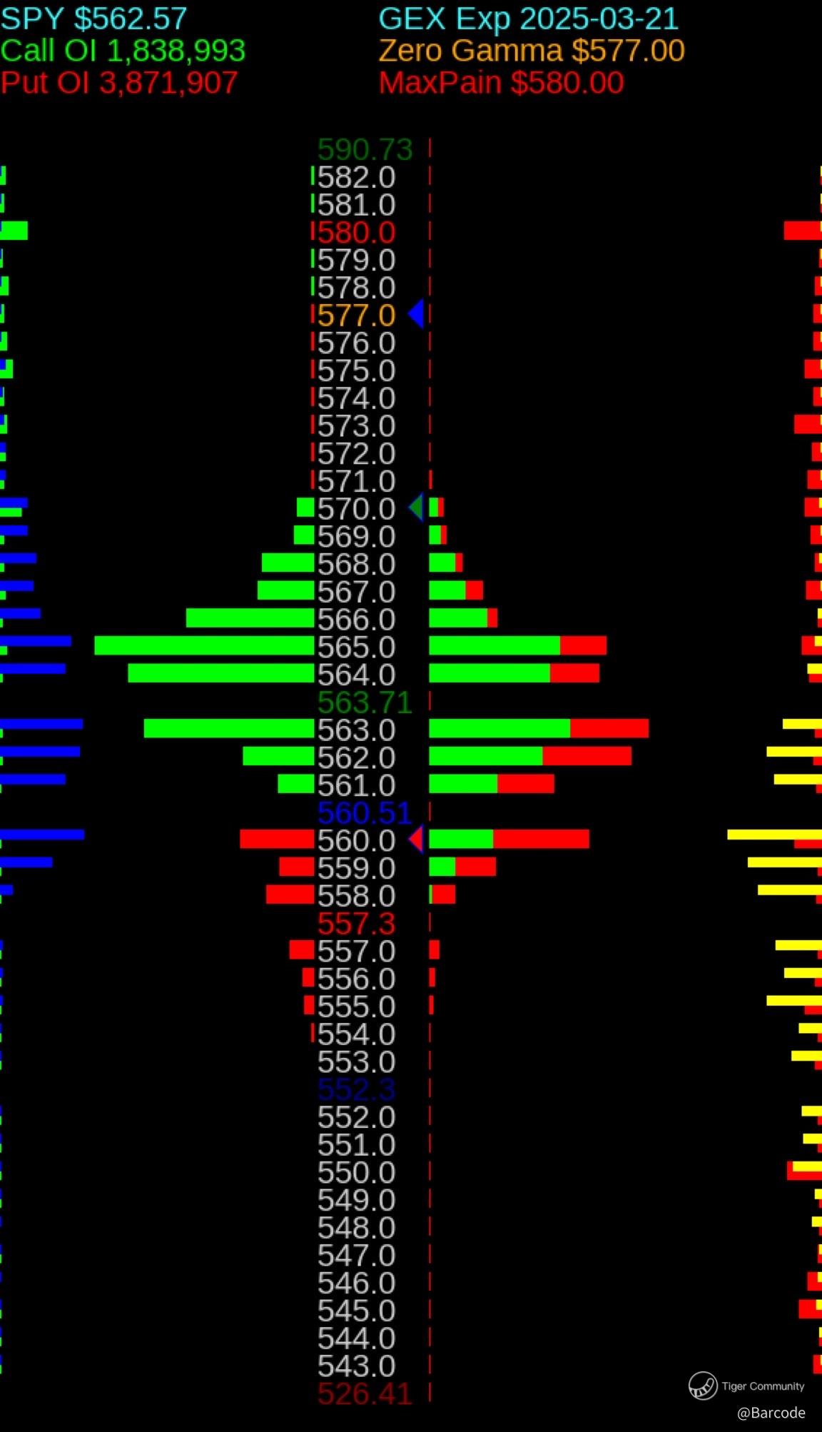 SPY’s position at $562.57, within a negative gamma regime, underscores the potential for sharp moves in either direction. The options chain reveals a bearish tilt, but holding above $558 as an interim low is crucial for a bullish week starting 24Mar25. A break above $563.71 could ignite a rally towards $570.00, supported by bullish sentiment from analysts like Kostin. However, downside risks remain, with $555.00 as a key support level if macro headwinds intensify. By balancing options dynamics with macroeconomic insights, investors can navigate SPY’s volatility with precision, positioning for both opportunity and risk in an uncertain market landscape.