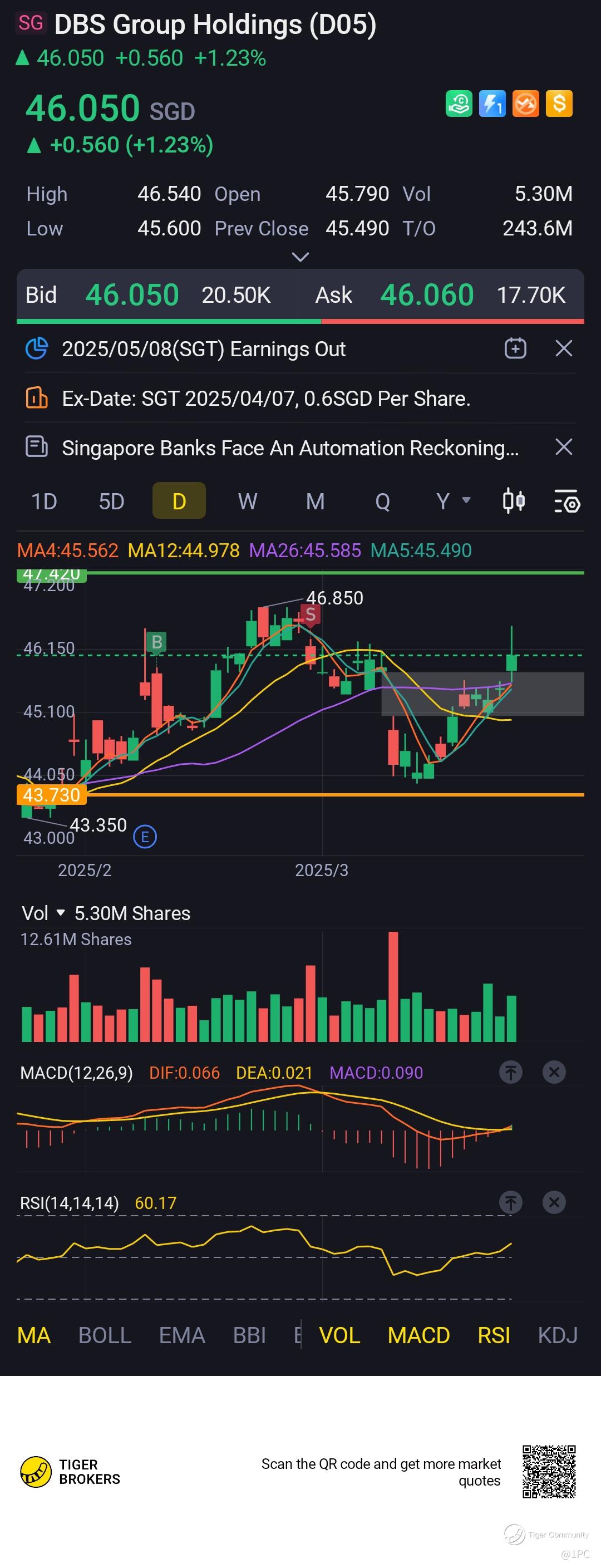 $DBS Group Holdings(D05.SI)$ DBS looks Bullish π today & opportunity might be knocking again π Price holding above MA26 while Short Term MA 5 has been running for about close to 2weeks. However Upside Resistance of 46++ is also near by, hence, Trade carefully & with Tight Control SLπ. MACD is following closely with Cross + RSI 65 Strong area. I would wait for a slight dip to try a position π. Managed your Risk & Stop π.