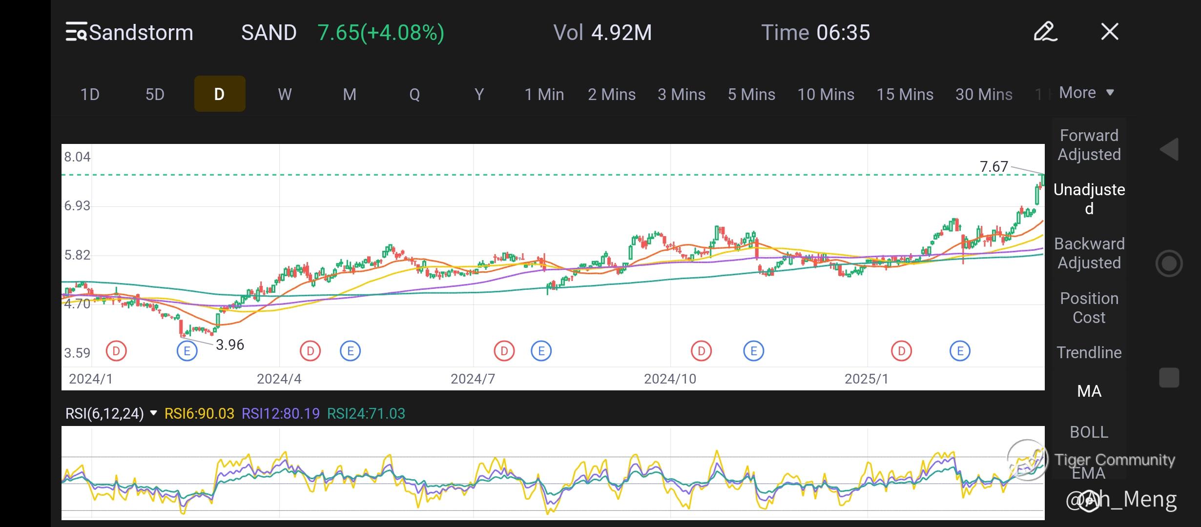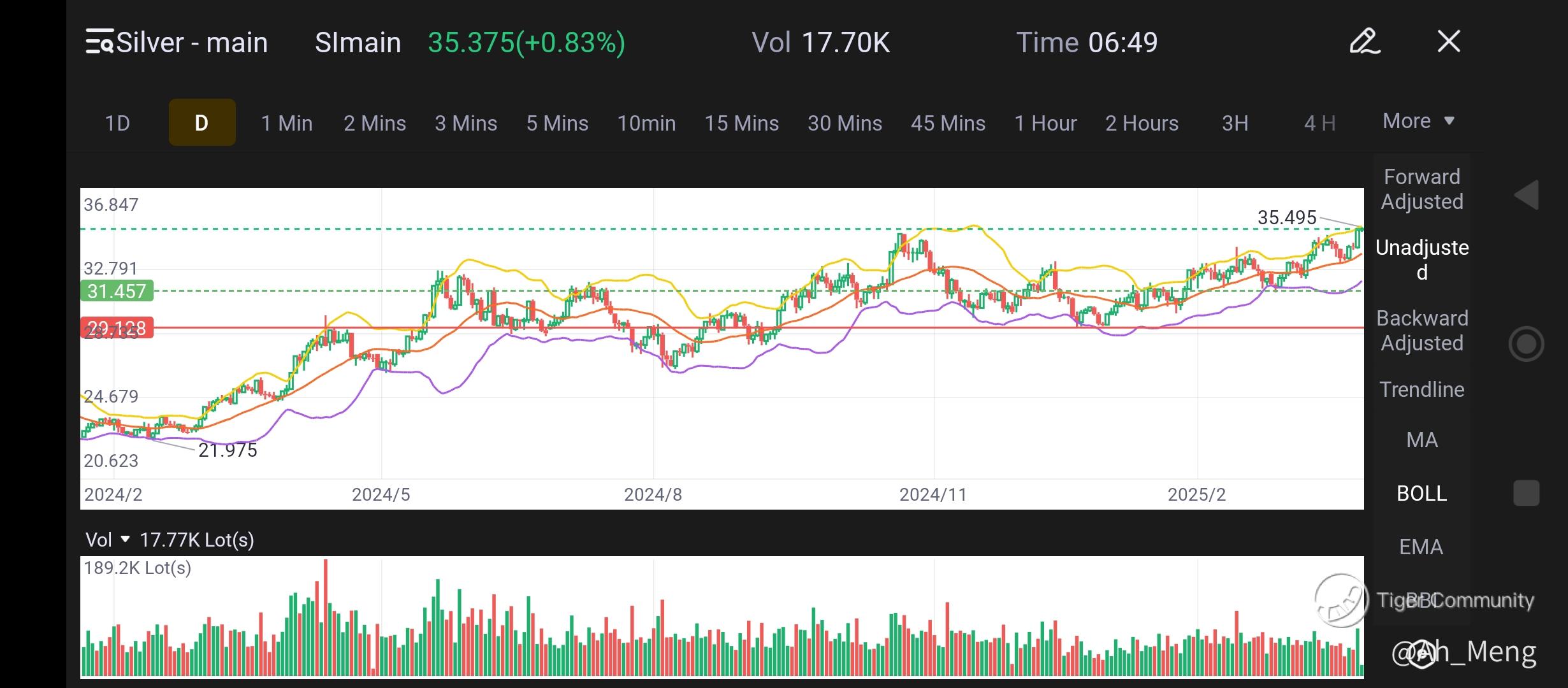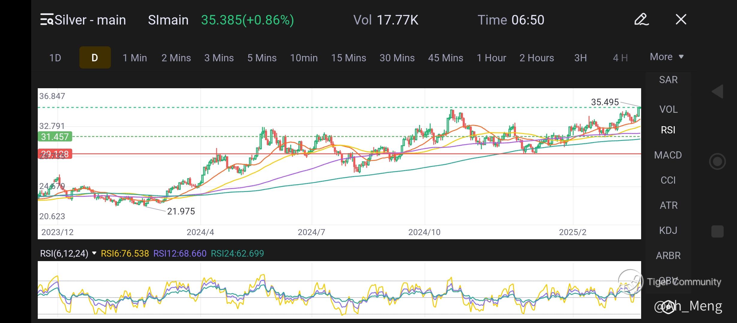 Silver chart shows similar uptrend, but not to the extent of the gold run... RSI indicator is strong but not overbought, while lying at the upper boundary of BOLL could signal getting closer to overbought position. Volume is fairly uniform throughout this run as well... But not too much, which has the same implication as RSI indicator.