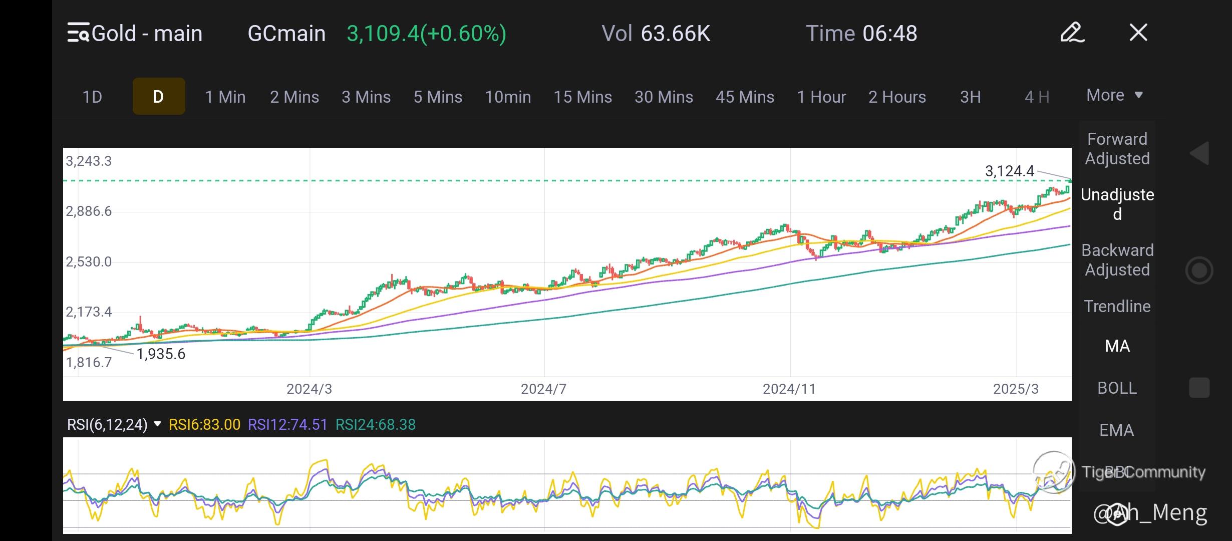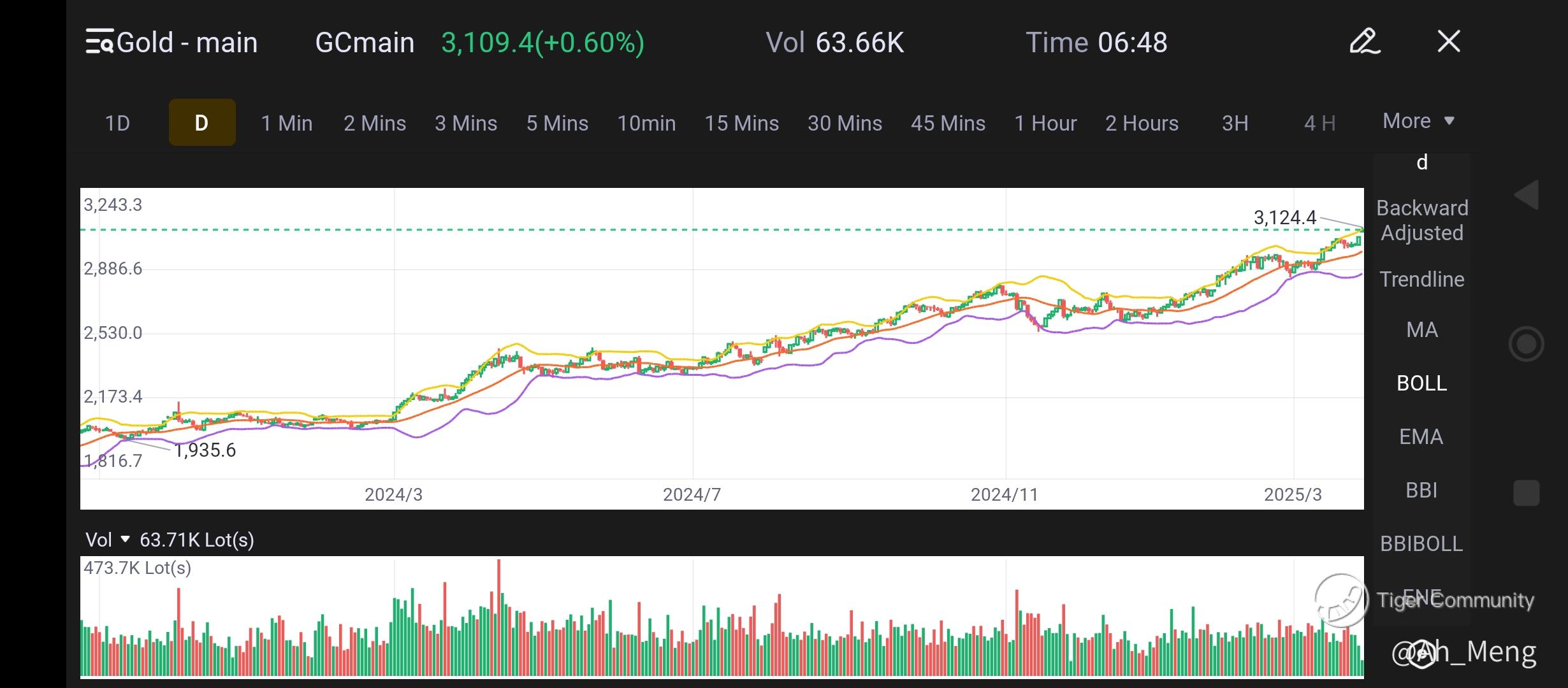 Gold chart is obviously showing it breaking its ATH. RSI indicator hits overbought position, so is BOLL, lying at its upper boundary. Volume has been fairly consistent throughout this run.