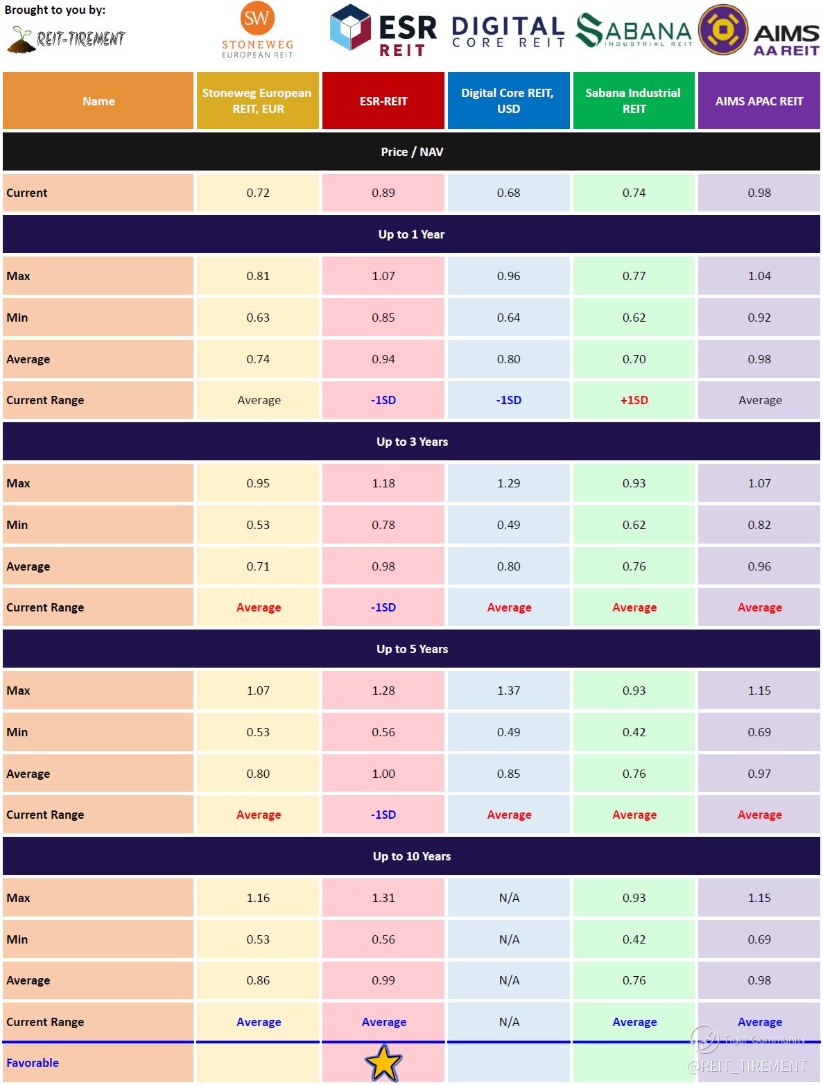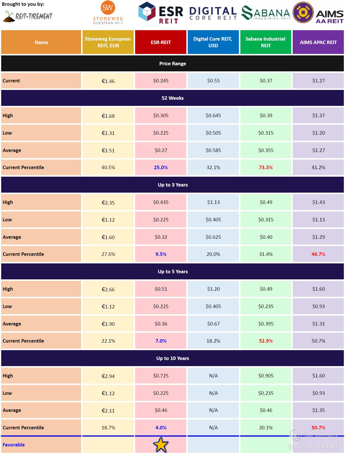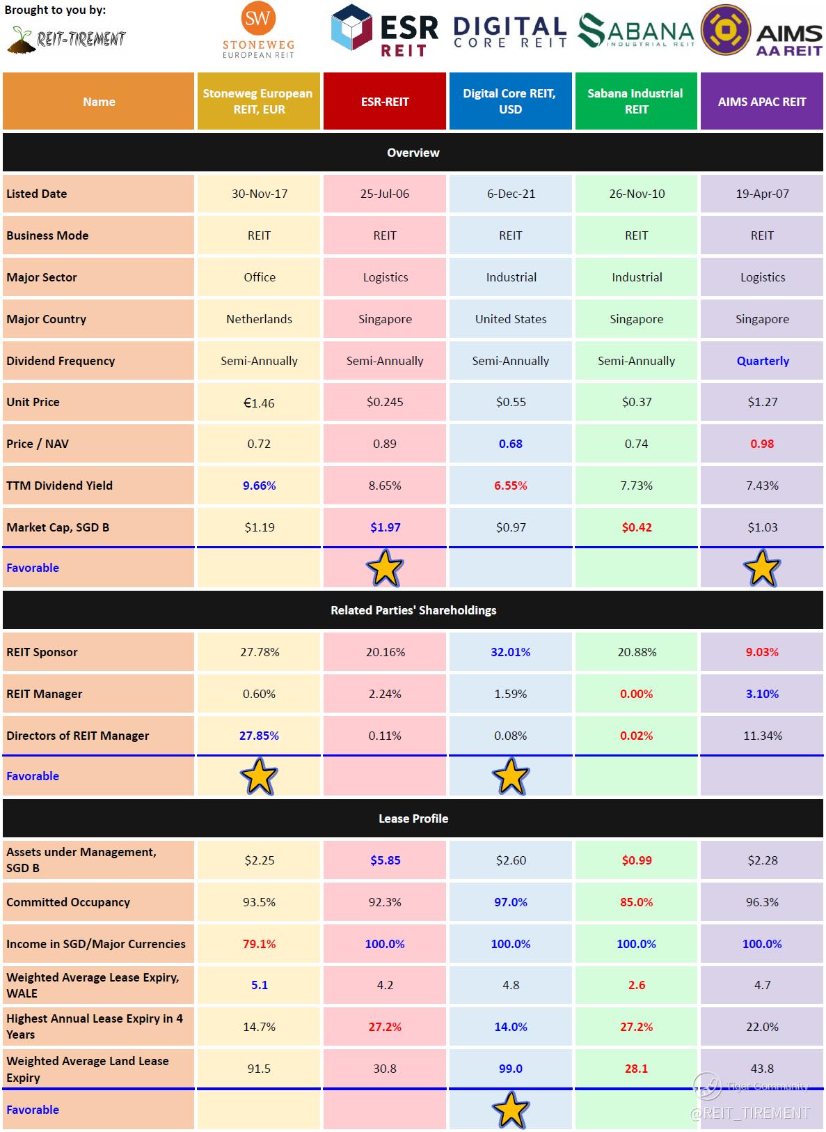$AIMS APAC Reit(O5RU.SI)$ $Stoneweg Reit EUR(CWBU.SI)$ $DigiCore Reit USD(DCRU.SI)$ $Sabana Reit(M1GU.SI)$ $ESR-REIT(J91U.SI)$