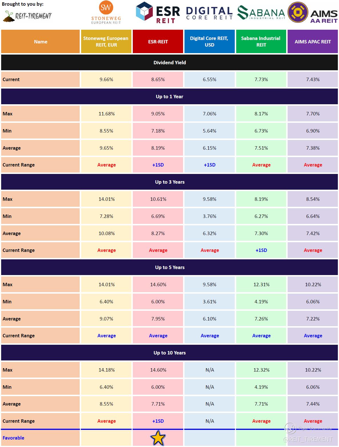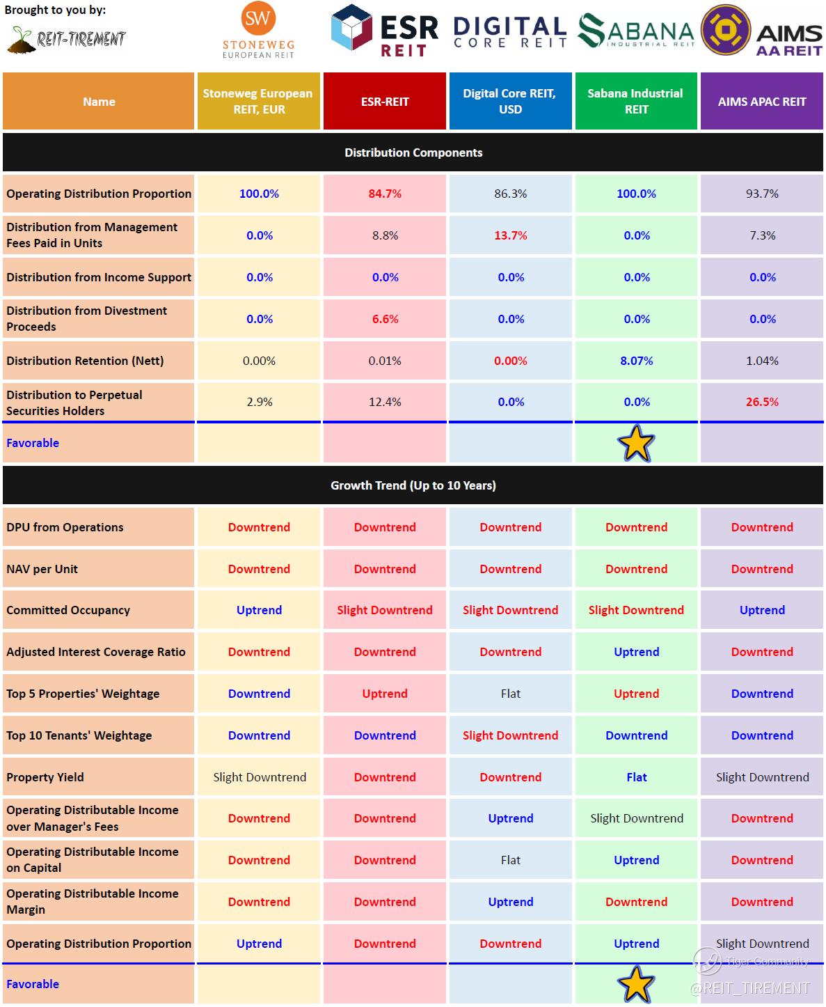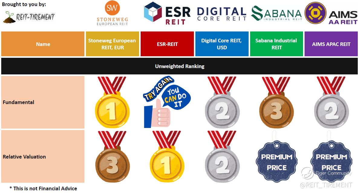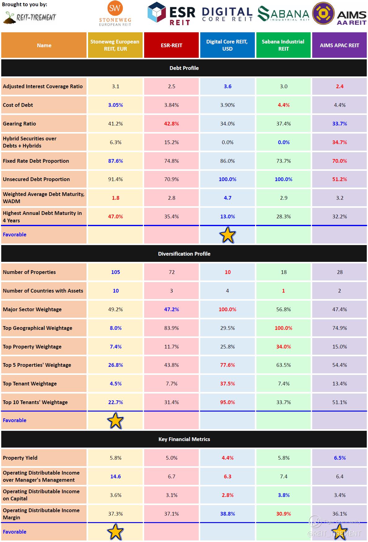 The above is just a quick comparison without weightage assigned. For more information, check out REIT-TIREMENT