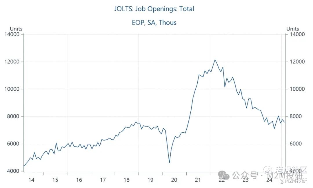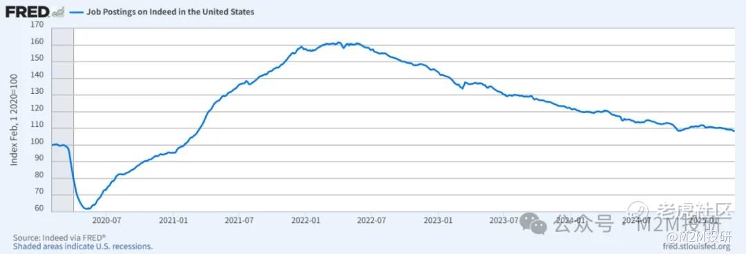 2月職位空缺數繼續放緩,從1月份修正後的776萬降至757萬。下滑主要由零售貿易、金融活動和住宿餐飲業下降所推動。私人招聘網站數據(Indeed.com)同樣顯示出職位空缺數在持續下行,表明就業市場在緩慢冷卻。