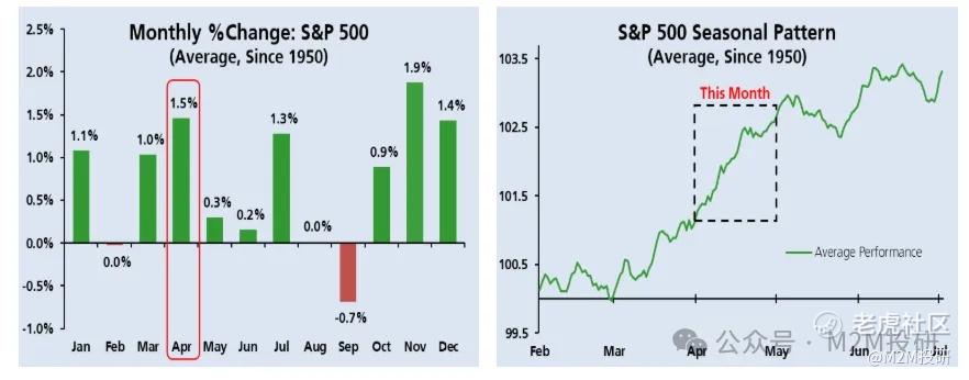 今日分享一則美股季節性特徵的報告。從歷史數據來看,4月是SP500表現相對較好的月份,自1950年以來月均上漲 1.5%(下圖左),也是一年股票業績表現第二好的月份。
