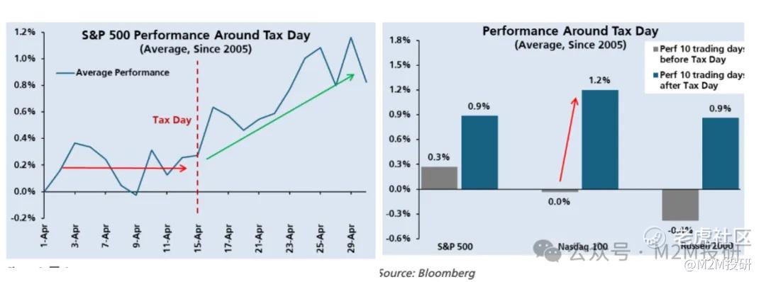 但是由於納稅的截止日期是4月15日。過去20年,SP500指數往往只有在納稅日過後纔開始上漲(下圖左),這可能是由於散戶會出售股票來支付稅款。而且這種現象逐漸形成慣例並且很可能出現自我實現,納斯達克和羅素2000指數對此的反應也很明顯(下圖右)。