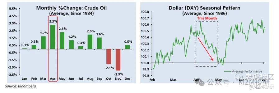 另外,四月也是一年中原油表現最強勁的月份(下圖左)。美元走弱的趨勢也助長了原油的上漲,而四月曆來是一年中美元表現第二差的月份(下圖右)。