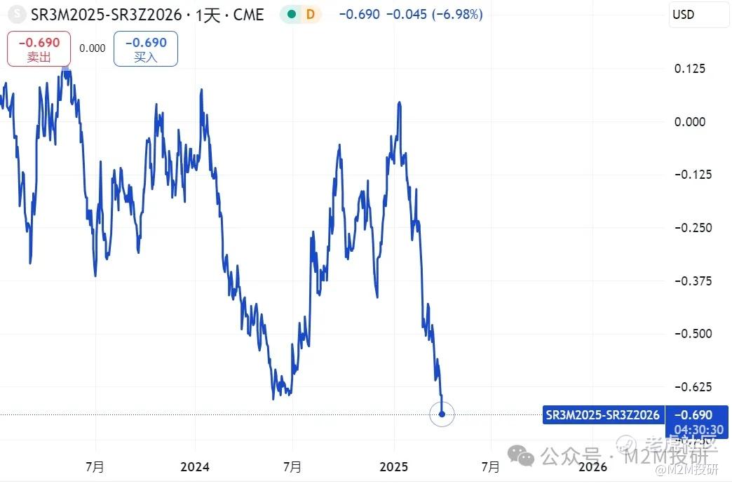 年初迄今,因爲通脹的原因,降息被大幅後置。SOFR期貨Z6(26年12月)和M5(25年6月)合約所隱含的利差持續向負值下探。這意味着市場在今年下半年和明年定價了更多的降息。