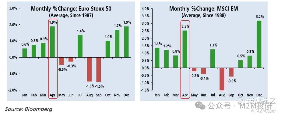 另外,從全球市場來看,也存在着一些季節性。美國的資金流出也支撐了其他國家的股指。歐元區斯托克指數和 MSCI 新興市場指數在4月也都表現出強季節性。