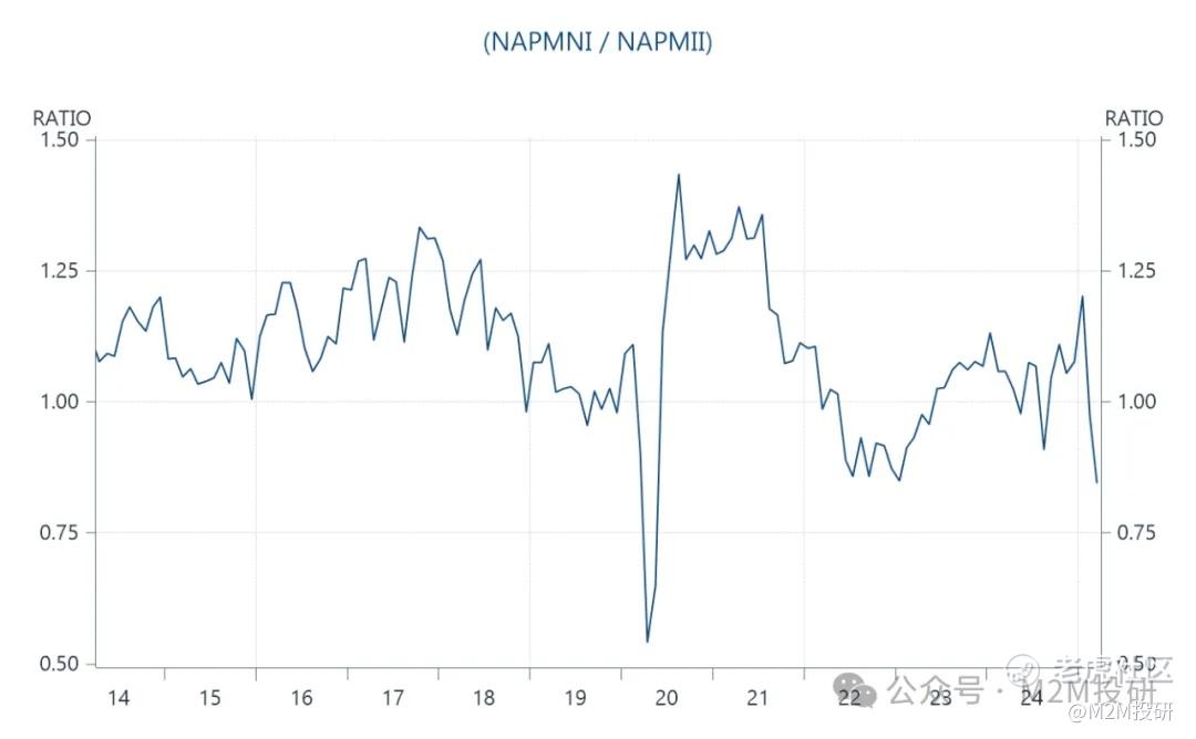與此同時,企業在加息前急於搶進口,推動庫存指數升至53.4,爲2022年10月以來的最高水平,幫助支撐了整體指標。但相應地,領先指標新訂單與庫存之比在3月大幅下滑,降至週期低點。