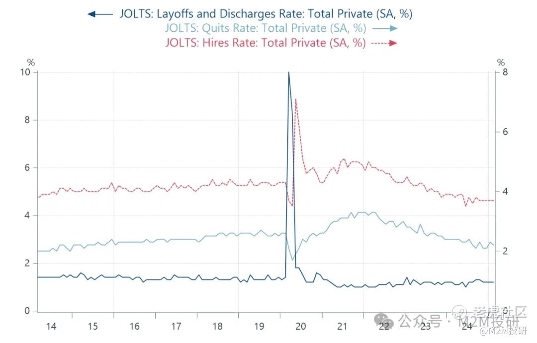 勞動力市場的流動性依然凝滯,呈現出鮑威爾口中“低裁員、低招聘”的狀態。跳槽率小幅回落,而裁員率和招聘率則與前月持平。當前勞動力市場維持超穩態,有利於美聯儲保持耐心的立場,但關稅衝擊正在加劇下行風險。