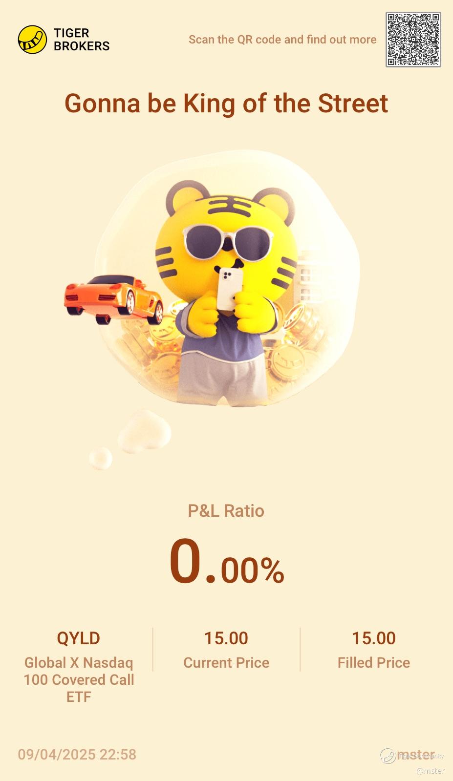 $Global X Nasdaq 100 Covered Call ETF(QYLD)$ Nibble a bit of QYLD partly to full fill the daily task and gain a chance to win some Tiger coins.