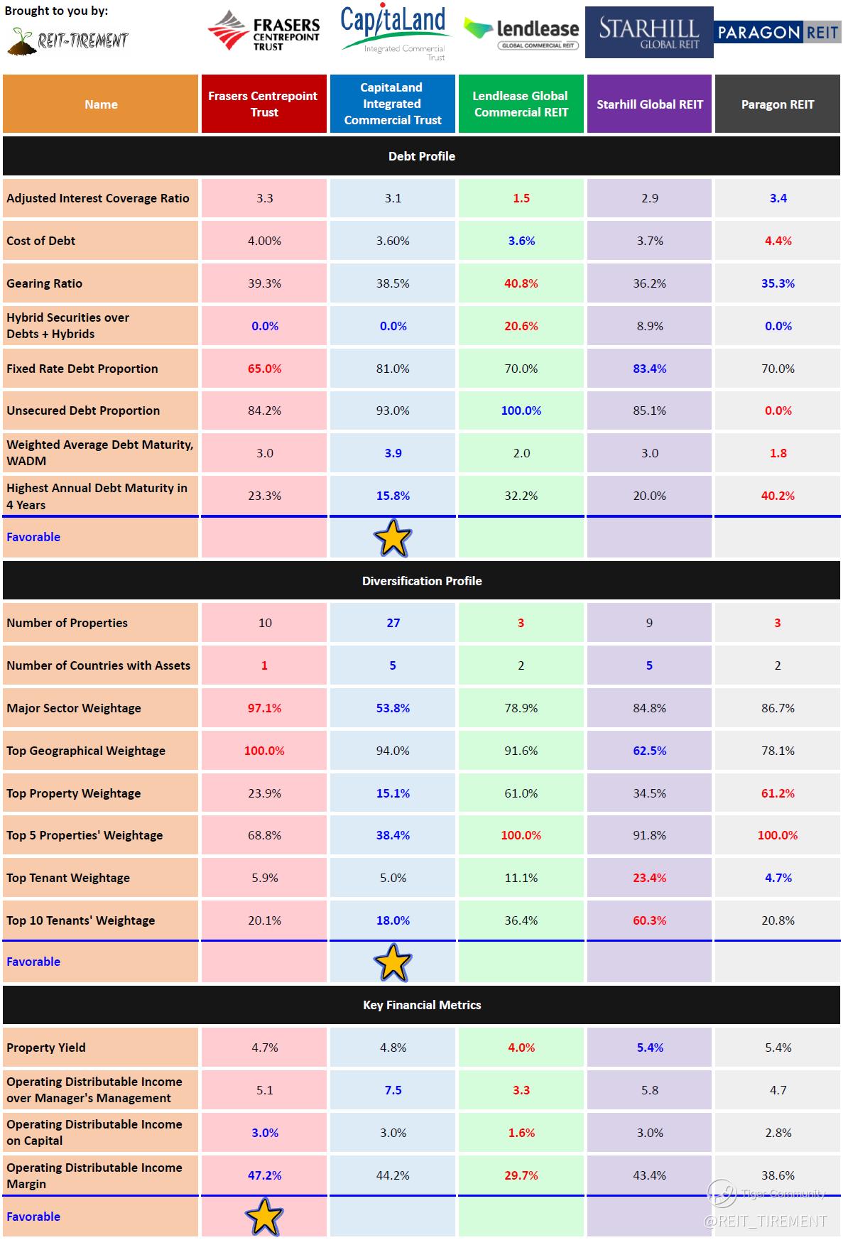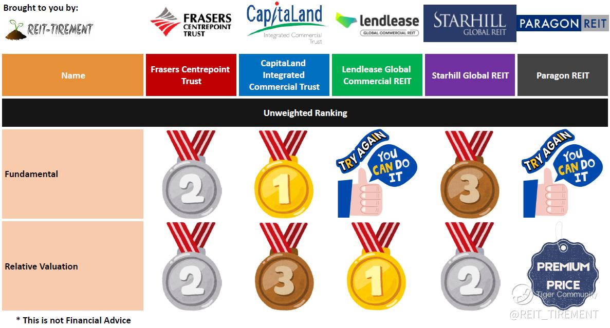 The above is just a quick comparison without weightage assigned. For more information, check out REIT-TIREMENT