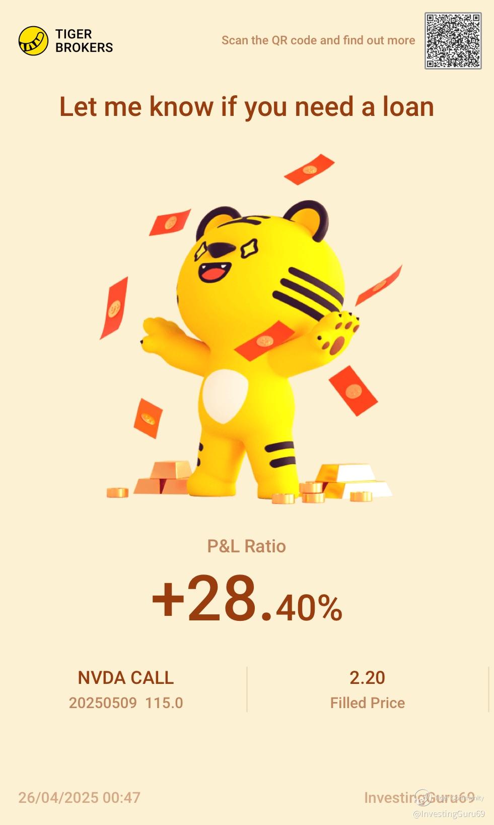 $NVDA 20250509 115.0 CALL$ Another quick trade, taking profit after consecutive green days in the market. Small profit always better than potential losses!!