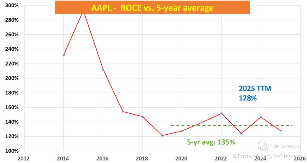 With the above, you can see that AAPL’s ROCE is above 100% in recent years, extremely competitive even compared to overachievers like the FANNMG or Mag 7 stocks. It is indeed high-yield farm in Buffett’s words!