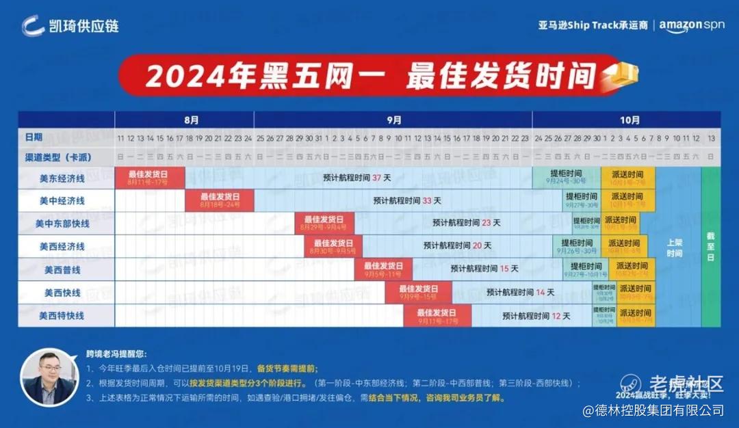 年底美國通常會有兩次消費熱潮,一個是黑色星期五,一個是聖誕購物季。以2025年的黑色星期五(11.28-12.01)爲例,亞馬遜通常會要求商家在10月25日前就要把商品入庫。入庫之前的運輸、提櫃、派送都要時間,根據航線不同通常在1-2個月。