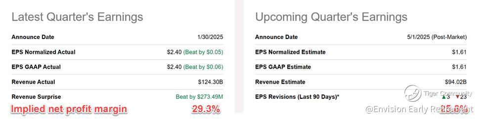Even with the loyalty of APPLE STOCK fans, I don’t expect APPLE STOCK to be able to fully pass on the additional cost to its customers and thus I expect a noticeably margin pressure in its Q2 ER. This seems to be the view of the market consensus too. As an example, the chart below describes APPLE STOCK stock's EPS projection, and my margins estimates. To wit, in the past quarter, APPLE STOCK earned an EPS of $2.40 on a revenue of $124.30B. This resulted in an implied net profit margin of 29.3%. Looking ahead to the upcoming ER, the consensus EPS estimate is $1.61, and the revenue estimate is $94.02B. Assume the same number of outstanding shares as the last quarter, the implied net profit margin is 25.8% for Q2, translating into a margin compression of 350 basis points.