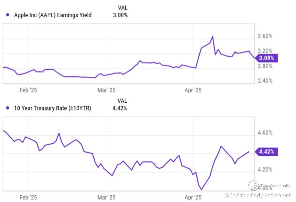 The above geopolitical and trade conflicts, besides impacting APPLE STOCK’s specific operations, have also altered a few key macroeconomic parameters. For example, the risk-free rates have decreased noticeably since my last writing. To wit, the chart blow depicts the changes in 10-Year Treasury Rate (I:10YR) since then. As seen, the reading was above 4.6% in Feb 2025. It dipped to as low as 4% in early April and now hovers around 4.4%. Risk-free rates act as gravity on all asset valuation, and I thus expect the current lower rate to better support for APPLE STOCK’s valuation. But APPLE STOCK’s valuation has moved in the opposite direction since my last writing. As seen, its earnings yield has increased quite sharply in this period. It started at around 2.8% at the time of my last analysis and climbed to the current level of 3.08%.