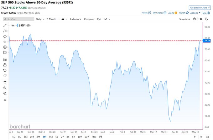 3.Almost 78% of S&P 500 $S&P 500(.SPX)$ stocks are now trading above their 50-day moving average, the most since October 📈