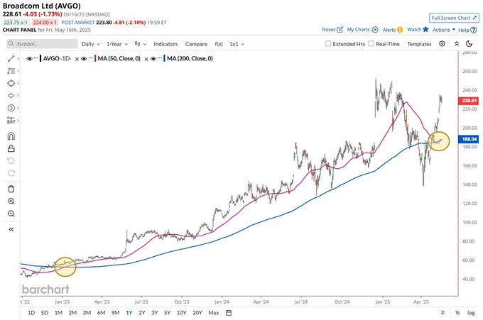 2.Broadcom $Broadcom(AVGO)$ forms a Golden Cross for the first time since January 2023 🚨 Shares went on to gain 338% over the next 22 months 📈📈