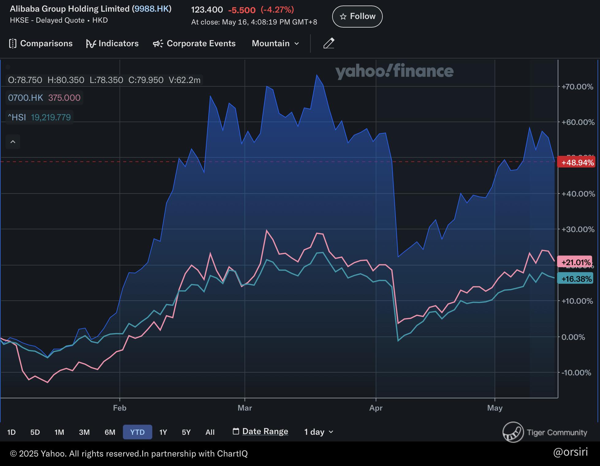 Despite the wobble, the stock is still up nearly 49% year-to-date, outperforming Tencent and the index alike. And with a trailing P/E of 17, a PEG of well under 1 if adjusted for normalised growth, and a 0.83% forward yield, there’s an argument to be made that Alibaba is one of the most mispriced blue chips in the world.