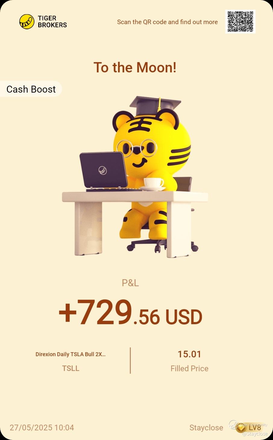 Entered TSLL at an average of $14.25 when TSLA hovered around $336–$338 last Friday, and fully exited today at $15.01 as TSLA opened strong at $346 during premarket.