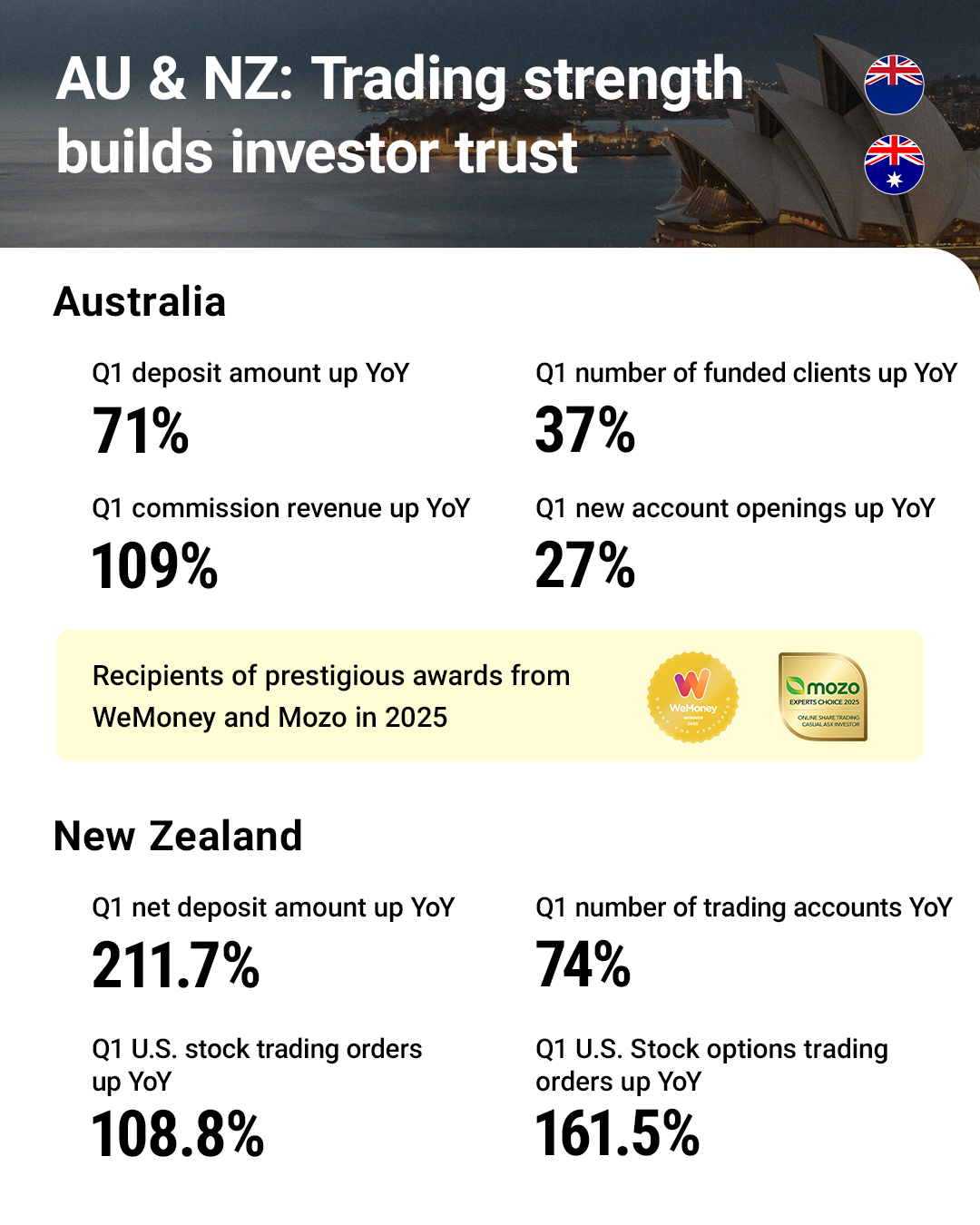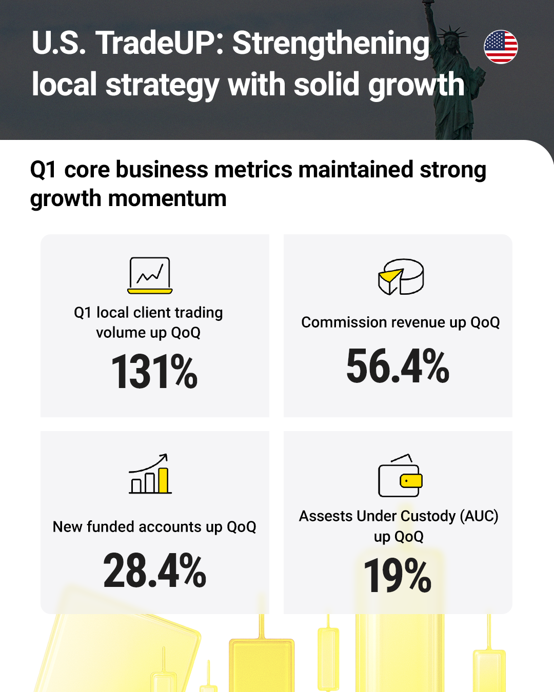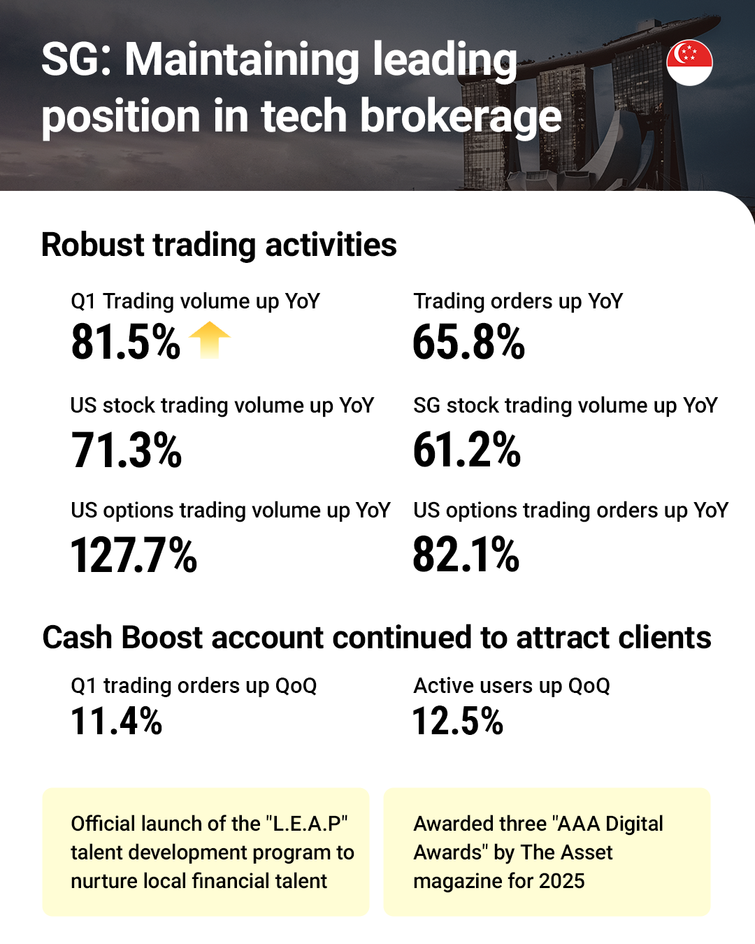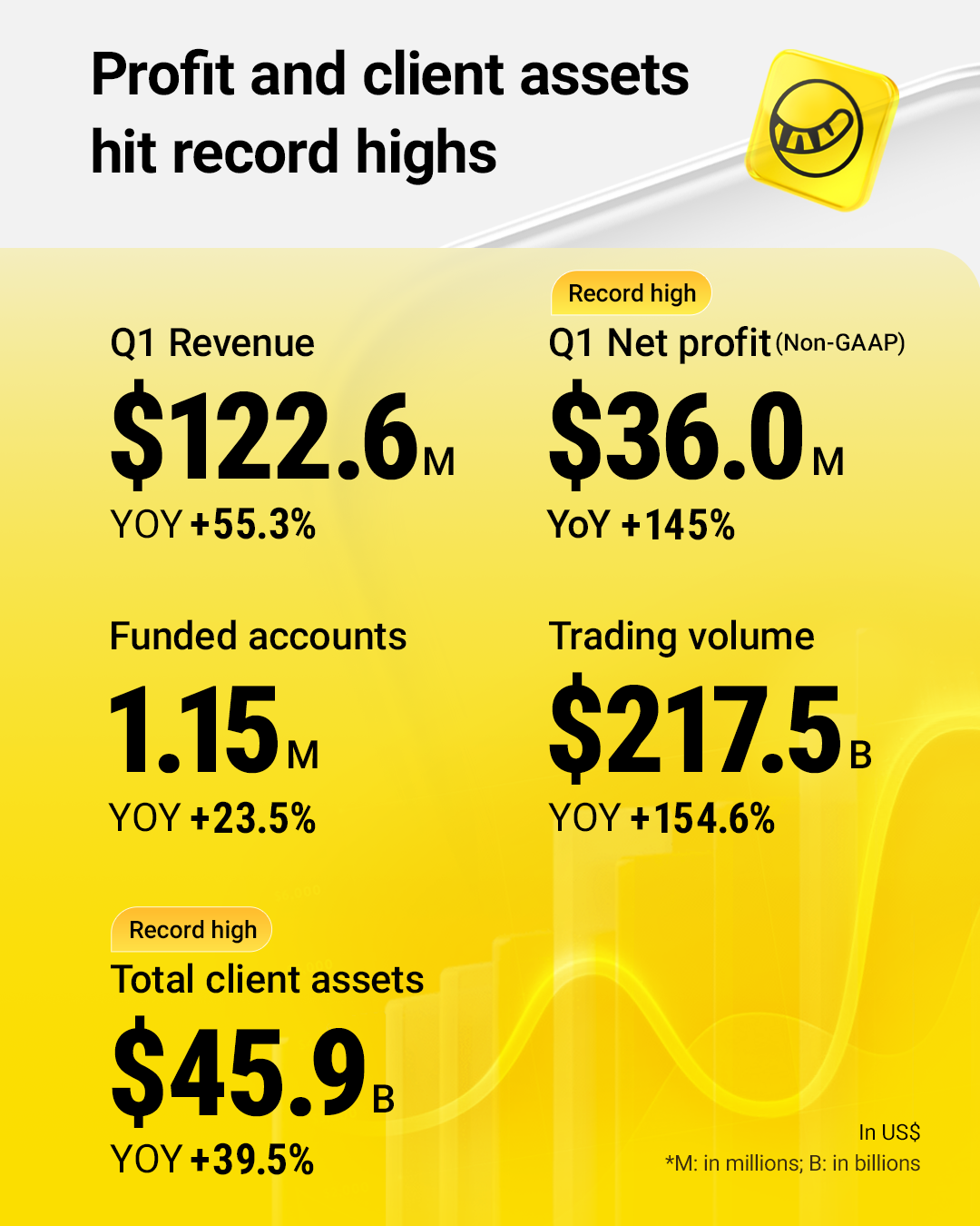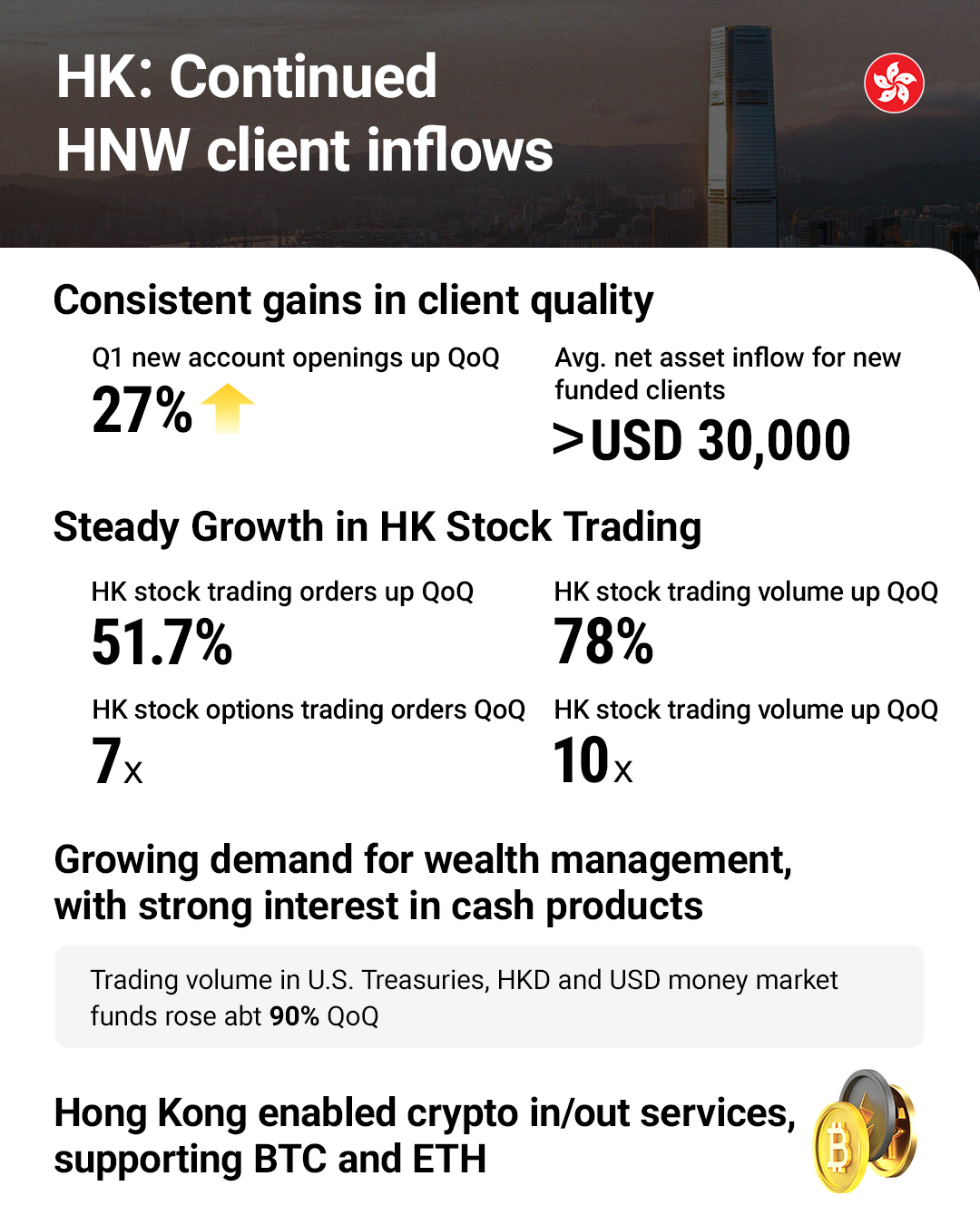 The company added 77,000 new accounts in Q1, up 49.8% YoY, bringing its total global accounts to 2.53 million. Funded accounts increased by 60,900, driving total funded clients up 23.5% YoY to 1.15 million. Trading volume in Q1 soared 154.6% YoY to US$217.5 billion. Net deposits remained robust at US$3.4 billion, propelled client assets to US$45.9 billion, nearly a 10% QoQ and 39.5% YoY increase, reaching a record high.