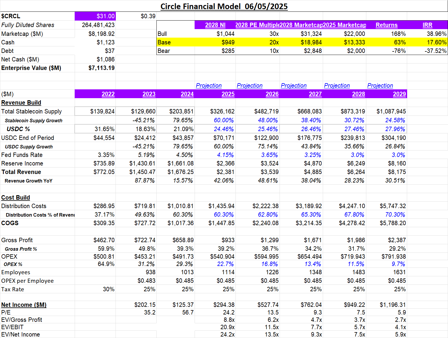 See from the $Circle Internet Corp.(CRCL)$ financial model below. $Circle Internet Corp.(CRCL)$ 's IPO valuation was raised to $31, and the Forward PE was 24 times. For a more extreme example, you can refer to the table just now, where the Forward PE in 2026 was about 30 times, which means it can be raised to more than $65.