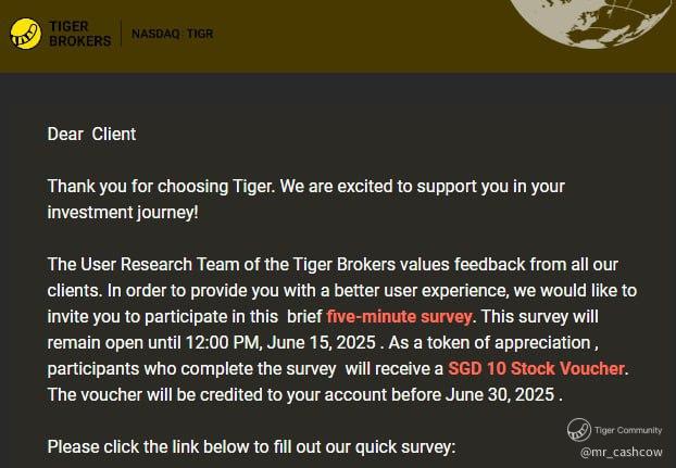 Tiger just dropped another survey regarding using AI tools for investment! Complete the survey to receive a 10SGD stock cash voucher![Miser]