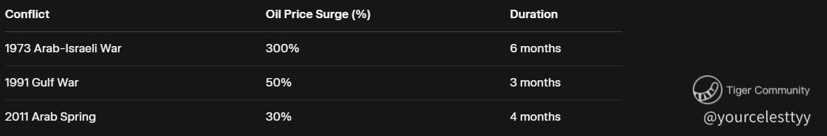 Stocks like ExxonMobil ( $Exxon Mobil(XOM)$ ) and Chevron ( $Chevron(CVX)$ ) are already up 3%, offering juicy yields (3.5% and 4.2%, respectively) to sweeten the deal. The Energy Select Sector SPDR ETF (XLE) climbed 2.4%, a broader bet on the sector’s rise. But oil’s a rollercoaster—demand could tank if global growth stumbles, or prices could crash if Iran and Israel step back from the brink. Check out this table of oil price moves during past conflicts: