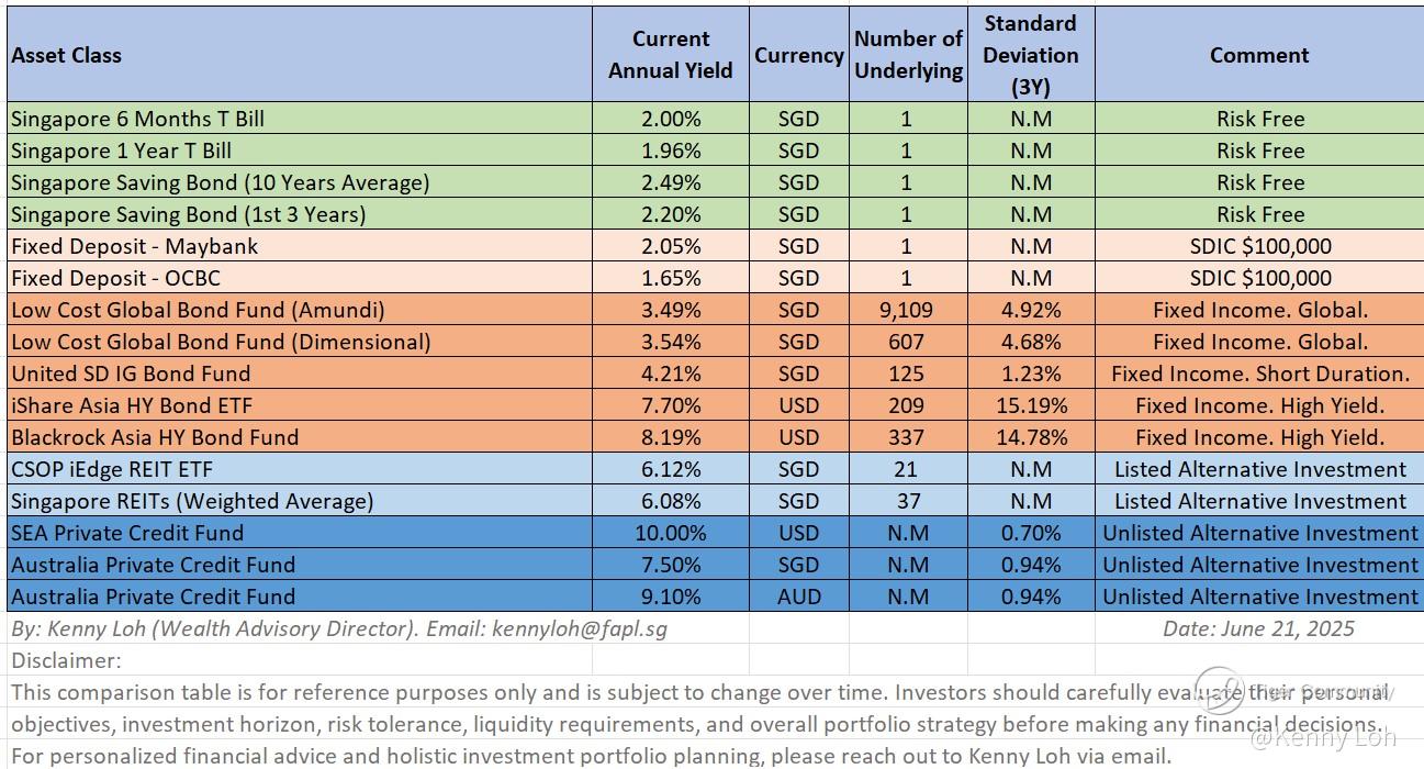 The latest yield comparison table (as of June 21, 2025) provides a comprehensive overview of fixed income and alternative investment options available to Singapore-based investors. The table highlights current annual yields, risk levels, and other key metrics across a spectrum of products, from government bonds to private credit funds.