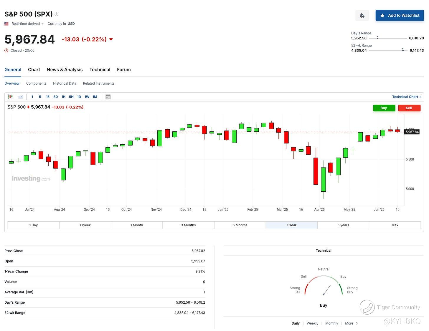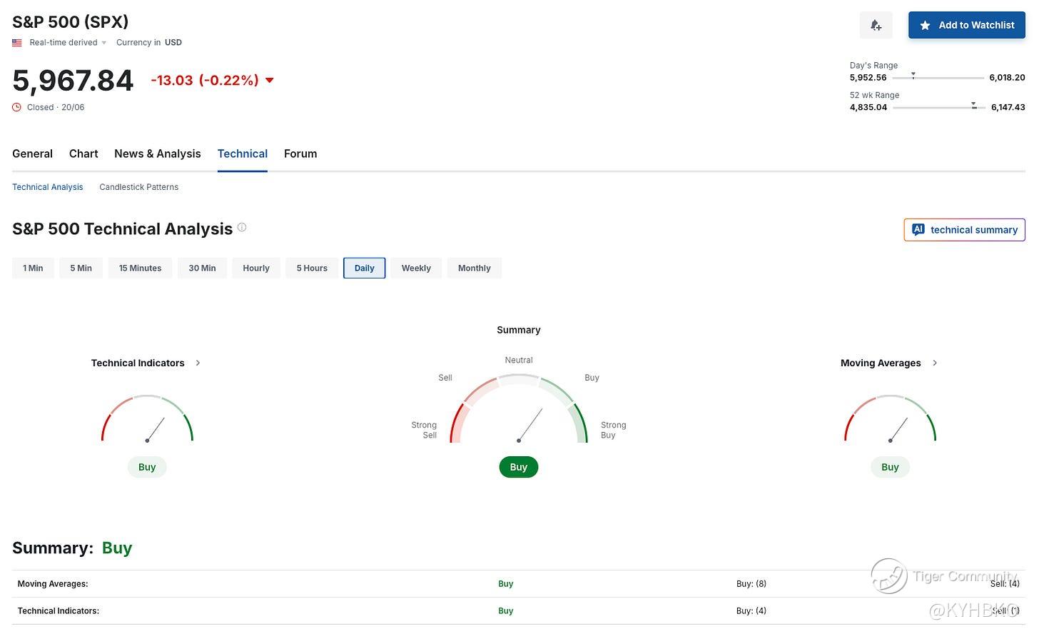 The daily interval is showing a “Buy" rating for the S&P 500 index.