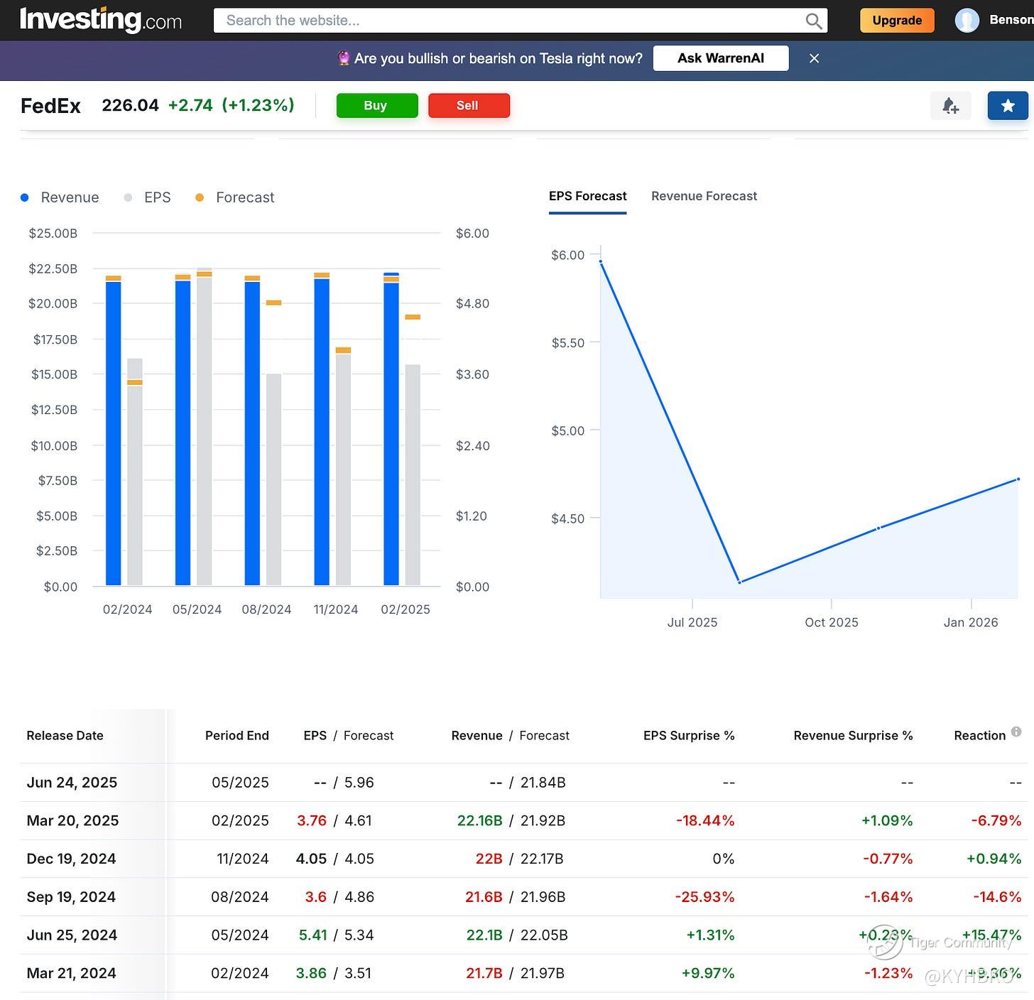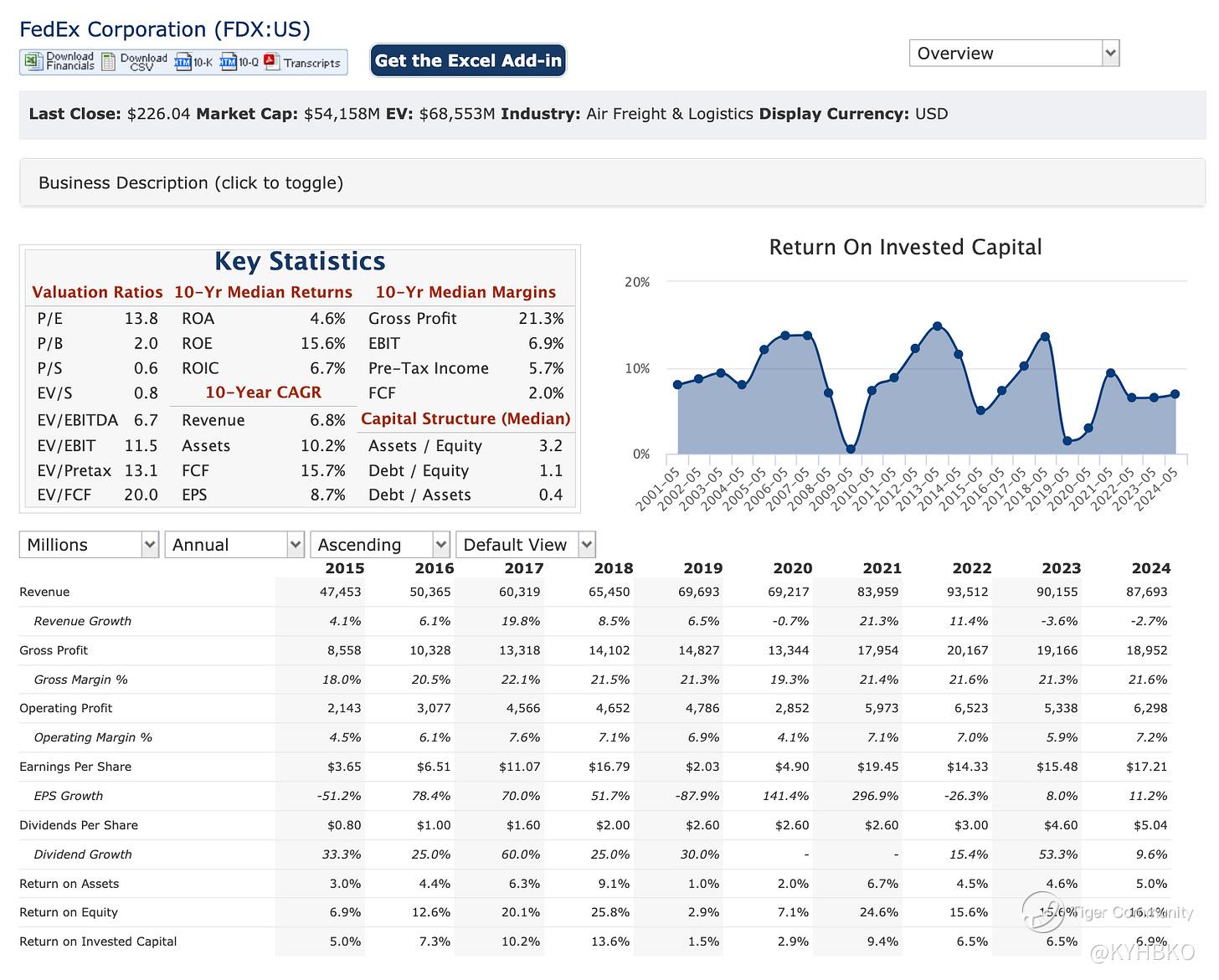 Over the past 10 years, FedEx has demonstrated resilience and growth, with revenue increasing at a 6.8% CAGR and EPS at an 18.7% CAGR, driven by its leadership in global logistics and e-commerce delivery. Operating profits grew to $6.298 billion in 2024, with margins improving to 7.2%, reflecting operational efficiency. The company has consistently raised dividends (15.7% CAGR), and its P/E ratio of 14.9 suggests a stable valuation. Robust FCF growth (15.7% CAGR) and a manageable debt profile (debt/equity 3.2) support its financial flexibility. FedEx’s competitive advantages include its extensive global network, diversified services (Express, Ground, Freight), and adaptability to e-commerce trends. However, recent revenue declines (-2.7% in 2024) and EPS volatility indicate challenges from market saturation and economic headwinds, which may require strategic adjustments as of June 2025.