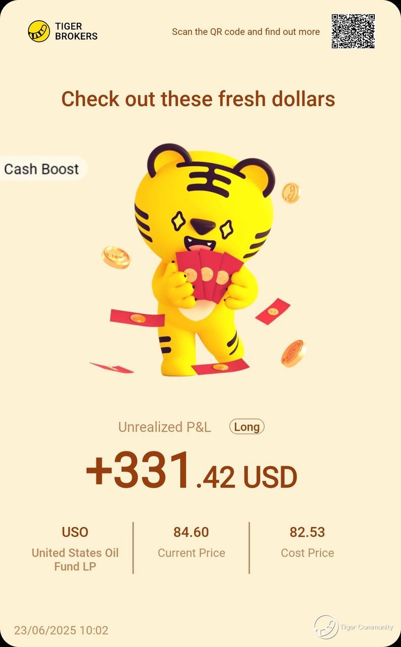 $United States Oil Fund LP(USO)$ Middle East tensions fueling oil rally, plus a technical breakout from a five‑year consolidation . My game plan now: secure part of the profit while keeping cost‑basis shares intact—this way I ride any further upside but lock in gains in case of a pullback. With this move, that $331 isn’t just a number, but a win earned on the trading floor.