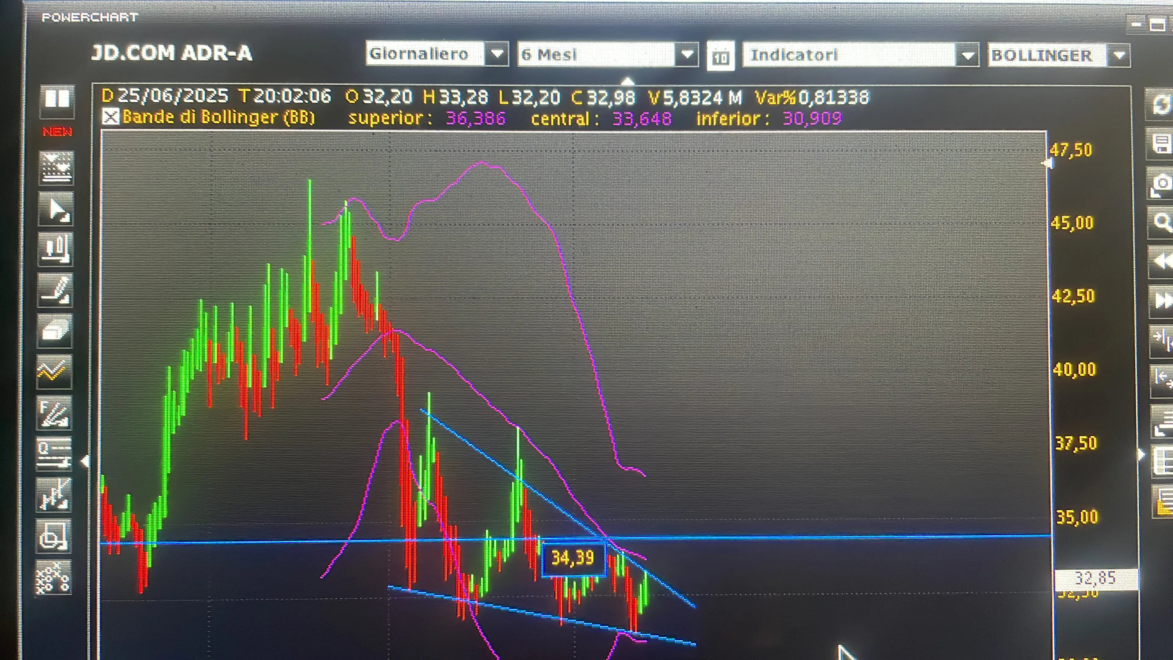 $JD.com(JD)$ We need to break through 34.5 for launch clearance, the authentic falling wedge pattern targets $30