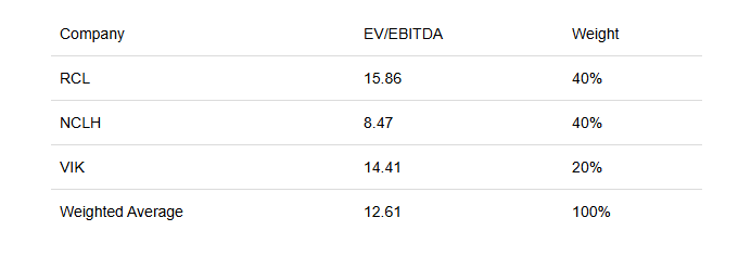 By applying a 40% weight to Royal Caribbean and Norwegian, and a 20% weight to Viking, due to its significantly lower debt load, my target EV/EBITDA multiple for Carnival is 12.61.