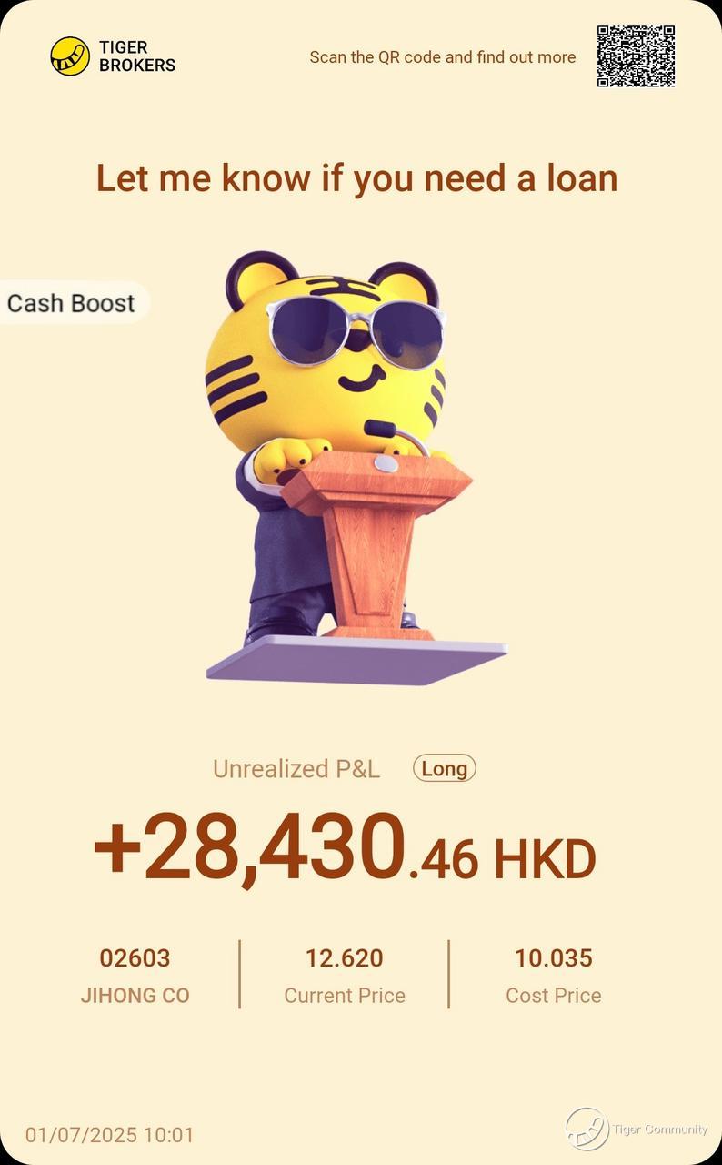 $JIHONG CO(02603)$ What a pleasant surprise! My JIHONG CO position has achieved an unrealized gain of 28,430.46 HKD! With the price rising from my entry at 10,035 to the current 12,620, that's over 25% return! This success reaffirms my stock selection strategy - patience and value investing always pay off in the long run. Holding strong for greater returns ahead!